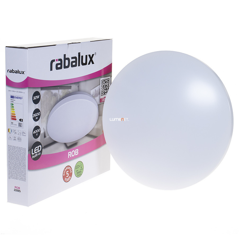 Lampa de tavan Rob Rábalux 2285 LED are un diametru de 38 cm și este proiectată într-un stil modern, utilizând materiale din metal alb și plastic. Modulul LED încorporat de 32 W oferă un flux luminos de 2600 lumeni cu o temperatură de culoare albă rece (4000 K), asigurând o iluminare eficientă și uniformă. Lumina nu este reglabilă și are protecție IP20, fiind potrivită pentru utilizare în interior. Durata medie de viață este de 25.000 de ore, iar greutatea este de 0,88 kg. Dimensiunile ambalajului sunt 39 × 39 × 7 cm, cu o înălțime de 63 mm. Sursa de lumină LED este încorporată și nu trebuie înlocuită.