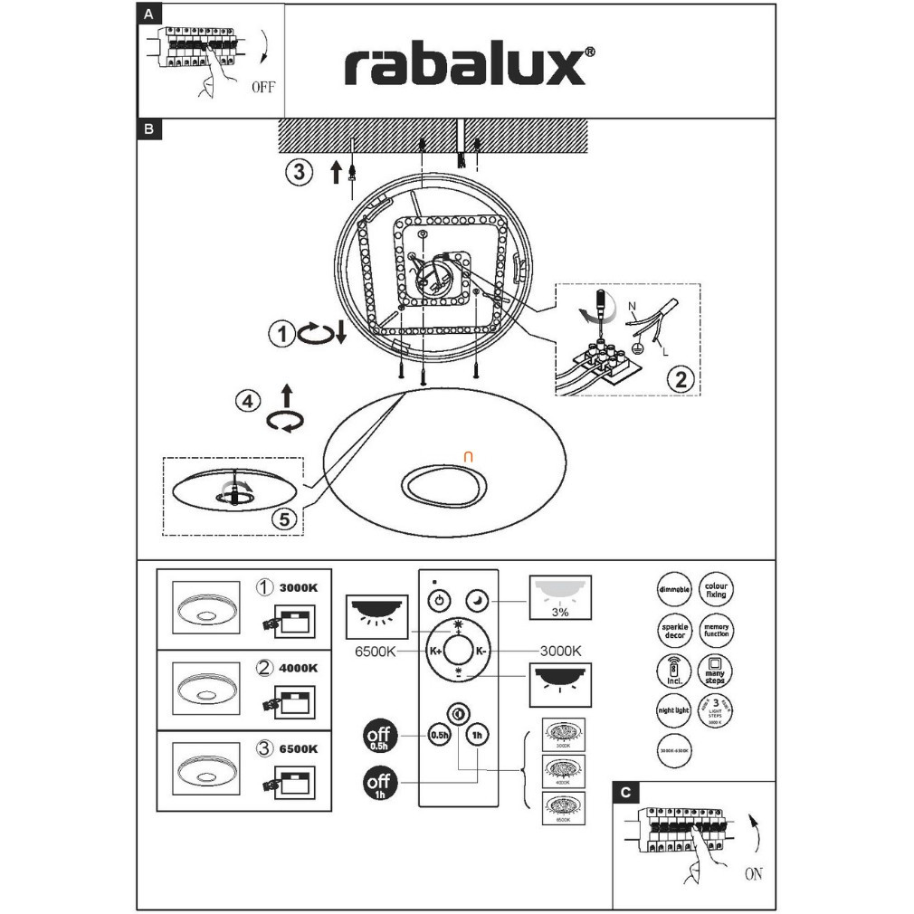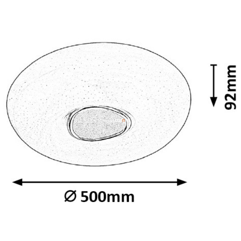 Lampa LED de tavan cu telecomandă 60 W, alb rece-cald - Tayla Rábalux 3328 este un corp de iluminat modern, montat pe tavan, care funcționează cu un modul LED încorporat de 60 de wați. Corp de iluminat are un flux luminos de 4200 lumeni și o temperatură de culoare care poate fi reglată între 3000 și 6500 Kelvin, permițând reglarea culorii luminii de la alb rece la alb cald folosind telecomanda inclusă. Produsul este fabricat din plastic și metal, are culoarea albă și argintie, un diametru de 500 mm și o înălțime de 92 mm. Lampa are o durată de viață medie de 25.000 de ore și un grad de protecție IP20, fiind potrivită pentru utilizare în interior. Sursa de lumină face parte din corp, astfel încât nu este necesar un bec separat.