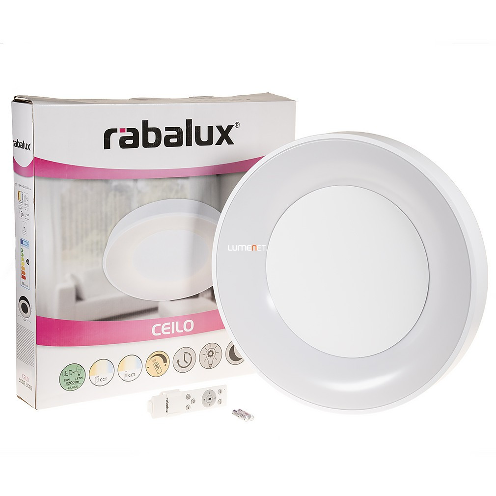 Lampa LED de tavan cu telecomandă Ceilo Rábalux 3083 oferă o soluție modernă de iluminat pentru spațiile de locuit. Modulul LED încorporat de 38 W oferă un flux luminos de 3200 lumeni, cu o temperatură de culoare care poate fi reglată între 3000 și 6500 Kelvin, permițând reglarea culorii luminii de la alb cald la alb rece. Corp de iluminat are un diametru de 480 mm, o înălțime de 80 mm, este fabricat din metal și plastic și are culoarea albă. Pentru control este disponibilă o telecomandă, care permite reglarea luminozității, funcția de memorie, temporizator și utilizarea luminii de veghe. Lampa cu clasă de protecție IP20 are o durată de viață medie de 30.000 de ore. Produsul conține o sursă de lumină LED, are un soclu pentru modul LED, dimensiuni de ambalare de 52x53x10 cm și cântărește 2,18 kg.
