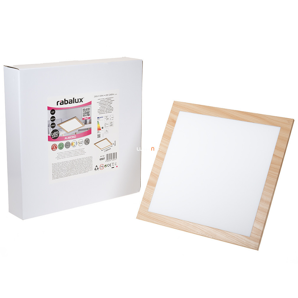 Lampa LED de tavan Rábalux Almond 6907 are un stil modern, cu o suprafață de culoare fag și alb, care conferă un aspect curat oricărui spațiu de locuit. Corp de iluminat este echipat cu un modul LED integrat de 12 W care emite 1260 lumeni de lumină într-o temperatură de culoare alb rece, de 4000 K. Lampa este fabricată din metal și materiale plastice și are protecție IP20, fiind potrivită pentru utilizare în interior. Produsul are o lungime de 295 mm, o lățime de 295 mm și o înălțime de 50 mm, cântărind 1,2 kg. Durata medie de viață este de 30.000 de ore, iar lampa nu este reglabilă. Pachetul include sursa de lumină, care este construită sub forma unui modul LED. Producătorul este Rábalux, iar codul logistic al produsului este 6907.
