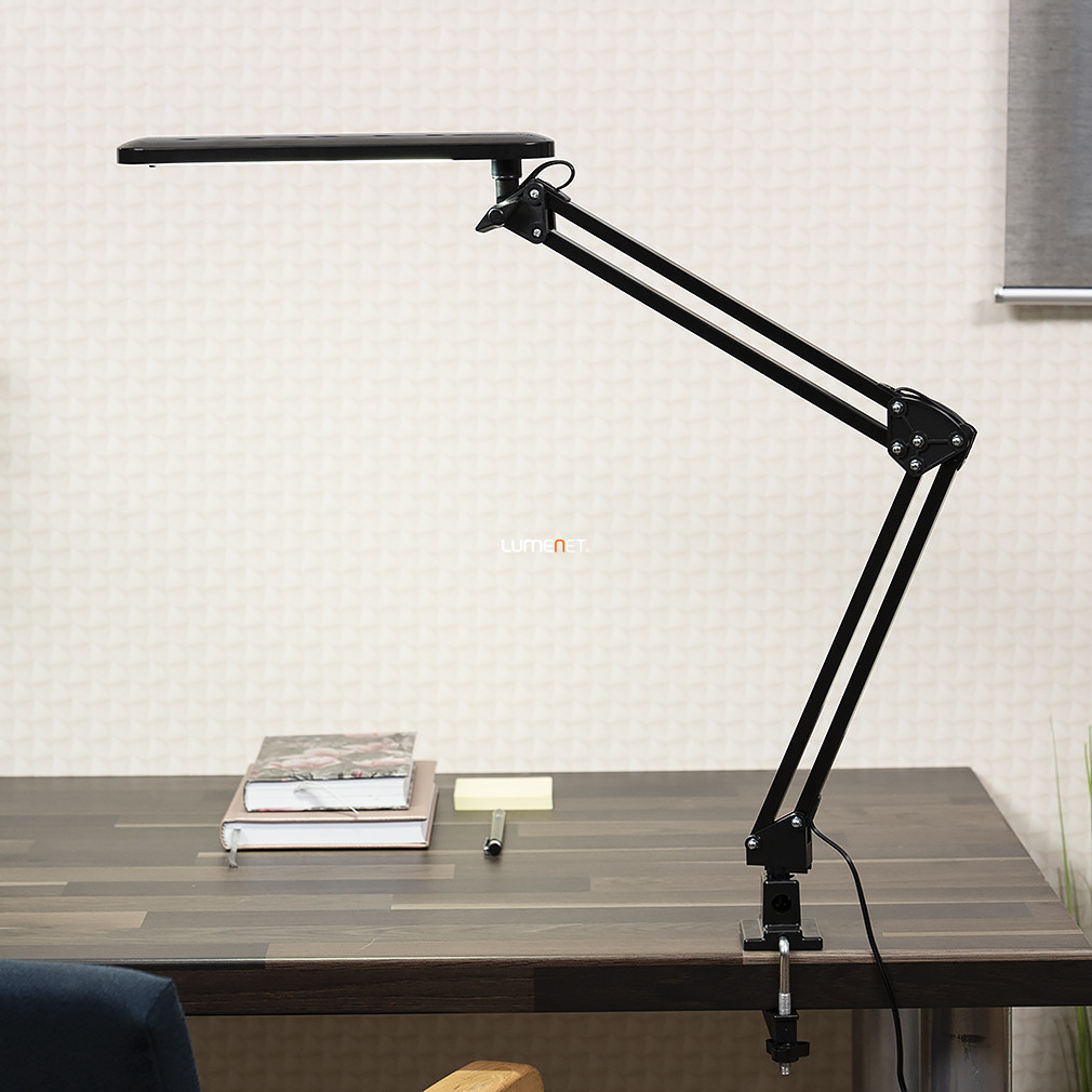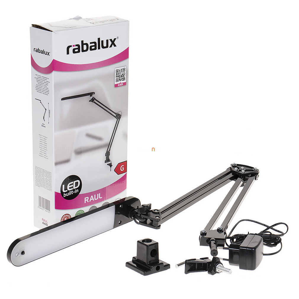 Lampa de birou cu LED-uri Raul Rábalux 4419 are un design modern, o lățime de 50 cm și combină materiale metalice și plastice de culoare neagră. Modulul LED încorporat de 5,6 W oferă un flux luminos de 350 lumeni la o temperatură de culoare de 4500 K, oferind o lumină albă rece. Lampa are o durată de viață medie de 30.000 de ore și este protejată IP20. Produsul nu este reglabil, este acționat de un întrerupător și include sursa de lumină. Corp de iluminat are o înălțime de 500 mm, fiind ideal pentru iluminarea suprafețelor de lucru sau a birourilor, iar designul său montabil permite fixarea sigură în locul dorit. Raul Rábalux 4419 îndeplinește cerințele moderne de iluminat rezidențial și este fabricat de Rábalux.
