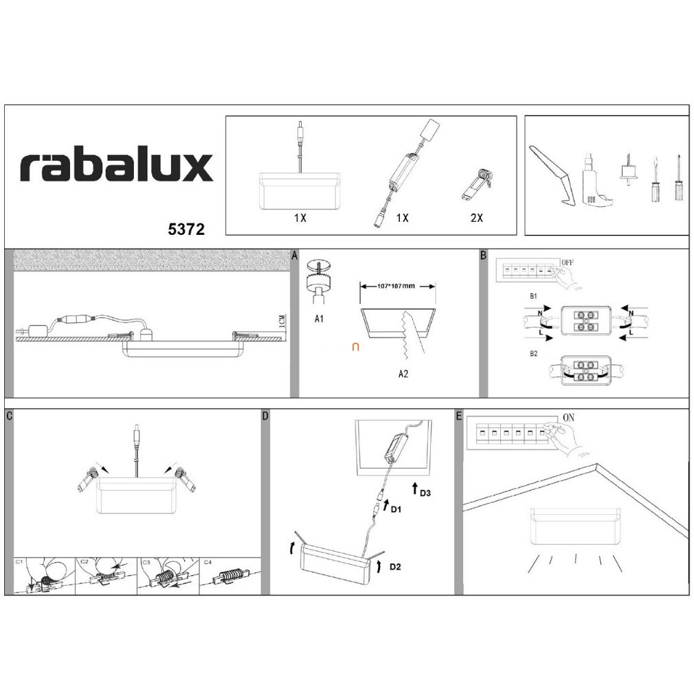 Lampa LED încastrată 12 W, alb rece, 12,3x12,3 cm - Oleg Rábalux 5372 este o lampă spot modernă care poate fi încastrată în tavane suspendate, oferind lumină albă rece cu un flux luminos de 1272 lumeni și o temperatură de culoare de 4000 K. Corp de iluminat este echipat cu un modul LED de 12 W, care nu este reglabil, iar sursa de lumină este încorporată. Lampa este de culoare albă, fabricată din plastic și metal și are un grad de protecție IP20/IP65, fiind potrivită pentru utilizare în interior. Dimensiunile produsului sunt 123x123x25 mm, iar dimensiunea decupajului de instalare este de 107x107 mm. Are o durată de viață medie de 20.000 de ore, asigurând o funcționare fiabilă pe termen lung. Stilul modern al acestei lămpi, fabricată de Rábalux, se potrivește bine cu soluțiile contemporane de iluminat pentru locuințe.