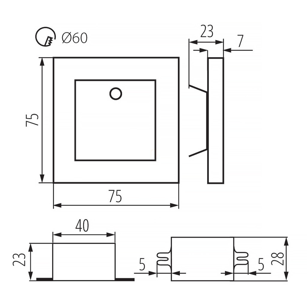 Lampa LED încastrată cu senzor de mișcare pentru scări Kanlux Apus 29856 are un modul LED eficient din punct de vedere energetic, de 0,8 W, care oferă o putere luminoasă de 14 lumeni, cu o temperatură de culoare albă caldă de 3000 K. Produsul funcționează la o tensiune nominală de 12 V și are protecție IP20, fiind potrivit pentru utilizare în interior. Corpul de iluminat este fabricat dintr-o combinație de oțel și plastic, în culoare neagră, cu un aspect modern. Este echipat cu o funcție de senzor de mișcare care activează automat iluminatul atunci când este detectată mișcare. Designul încastrat necesită o dimensiune de decupare de 60 mm, iar corpul de iluminat are o lungime și o înălțime de 75 mm și o lățime de 23 mm. Produsul se vinde fără unitate de alimentare, iar sursa de lumină LED este încorporată. Dimensiunile sale compacte și consumul redus de energie îl fac ideal pentru iluminatul eficient din punct de vedere energetic în casa scărilor, coridoare sau alte spații interioare.