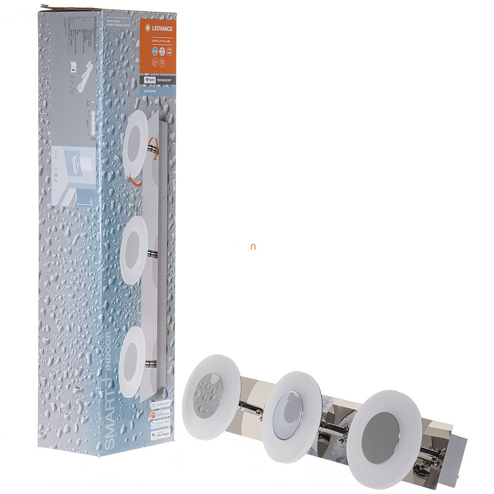 Lampa LED inteligentă Ledvance Smart+ WIFI pentru perete (Orbis Wall Wave) oferă o soluție modernă de iluminat pentru baie. Modulul LED integrat de 21 W oferă un flux luminos de 2100 lumeni, cu o temperatură de culoare care poate fi reglată între 3000 și 6500 Kelvin, permițând setări de lumină albă rece și caldă. Luminozitatea lămpii poate fi controlată prin intermediul unei aplicații și este compatibilă cu sistemele Google Assistant și Amazon Alexa. Cu protecție IP44, este potrivită pentru utilizarea în medii umede și are un grad de rezistență la impact IK03. Lampa este de culoare cromată, are o lungime de 520 mm, o lățime de 120 mm și o înălțime de 93 mm. Are o durată de viață medie de 30.000 de ore și o eficacitate luminoasă de 50 lm/W. Produsul este fabricat de Ledvance și conține o sursă de lumină LED.