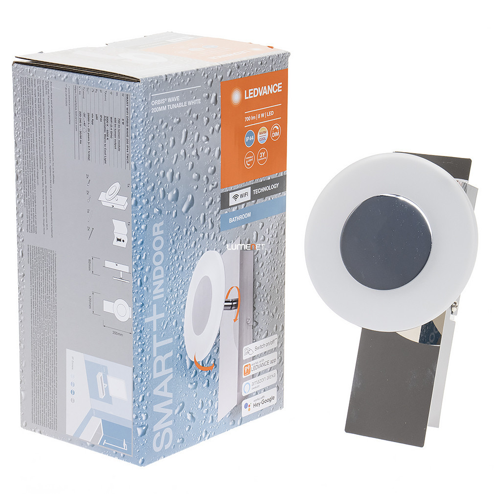 Lampa LED inteligentă Ledvance Smart+ WIFI (Orbis Wall Wave) are o putere de 8 W și un flux luminos de 700 lumeni, oferind o iluminare eficientă în băi. Lampa poate fi comutată între lumină albă rece și caldă, cu o temperatură de culoare între 3000 și 6500 Kelvin, care poate fi controlată prin intermediul unei aplicații sau al asistenței vocale Google Assistant sau Amazon Alexa. Produsul are protecție IP44, fiind rezistent la stropire, și rezistență la impact IK03. Modulul LED încorporat oferă o durată de viață lungă de până la 30.000 de ore și o eficiență luminoasă de 50 lm/W. Corp de iluminat este de culoare cromată și are dimensiunile de 200 mm lungime, 120 mm lățime și 93 mm înălțime. Lampa cântărește 0,55 kg, iar dimensiunile ambalajului sunt de 15x11x26 cm. Produsul este fabricat de Ledvance și include sursa de lumină.