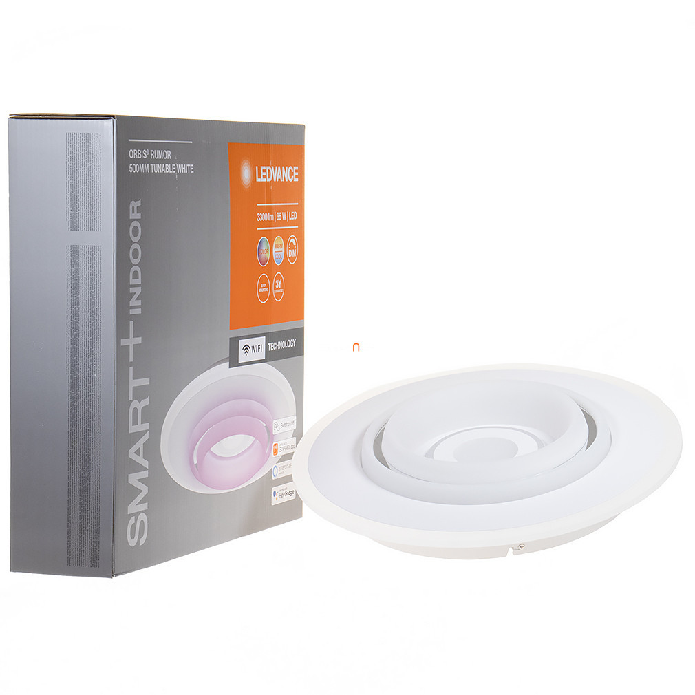 Lampa LED inteligentă Ledvance Smart+ WIFI pentru tavan (Orbis Rumor RGBW) este o soluție modernă de iluminat de 32 wați, cu un flux luminos de 3300 lumeni, care asigură o iluminare eficientă pentru spațiile de locuit. Temperatura culorii corpului de iluminat poate fi reglată între 2700 și 6500 Kelvin, iar datorită tehnologiei RGBW, poate emite și lumină albă și colorată variabilă. Modulul LED încorporat asigură o durată de viață lungă de până la 30.000 de ore, cu eficiență energetică maximă și o putere luminoasă de 210 lm/W. Produsul are protecție IP20 și rezistență la impact IK03, fiind potrivit pentru utilizare în interior. Este controlat prin intermediul unei aplicații și este compatibil cu sistemele Google Assistant și Amazon Alexa, astfel încât poate fi controlat și prin voce. Are un diametru de 500 mm, o înălțime de 100 mm și este disponibil în culoarea albă, cu un design modern și curat.