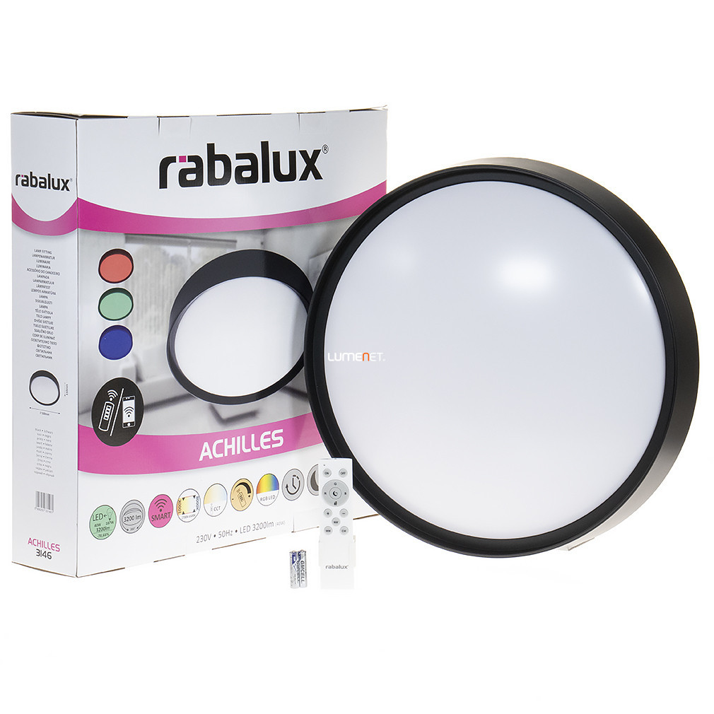 Lampa inteligentă LED pentru tavan Achilles-RGBW Rábalux 3146 este un corp de iluminat în stil modern, cu un diametru de 50 cm, dotat cu un modul LED integrat de 40 W și un flux luminos de 3200 lumeni. Sursa de lumină a corpului de iluminat oferă o temperatură de culoare variabilă în intervalul 2700-6500 Kelvin, precum și modul de culoare RGBW, astfel încât, pe lângă lumina albă, pot fi setate și alte culori. Intensitatea și culoarea iluminatului pot fi controlate prin intermediul unei aplicații sau al telecomenzii incluse, iar lampa dispune și de funcții de memorie, temporizator și lumină de veghe. Lampa are protecție IP20, este fabricată din metal negru și plastic și are o durată de viață medie de 25.000 de ore. Produsul are o înălțime de 110 mm, dimensiuni de ambalare de 54x54x12 cm și o greutate de 2,18 kg. Lampa de tavan fabricată de Rábalux conține un modul LED încorporat, astfel încât nu este necesară achiziționarea unei surse de lumină separate.