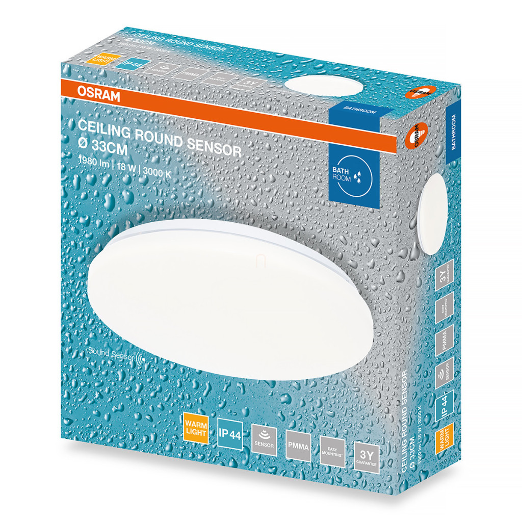 Lampă LED Osram Ceiling Round Sensor pentru baie, cu senzor de sunet și lumină, 33 cm, 18 W, 3000 K, 1440 lm, alb mat