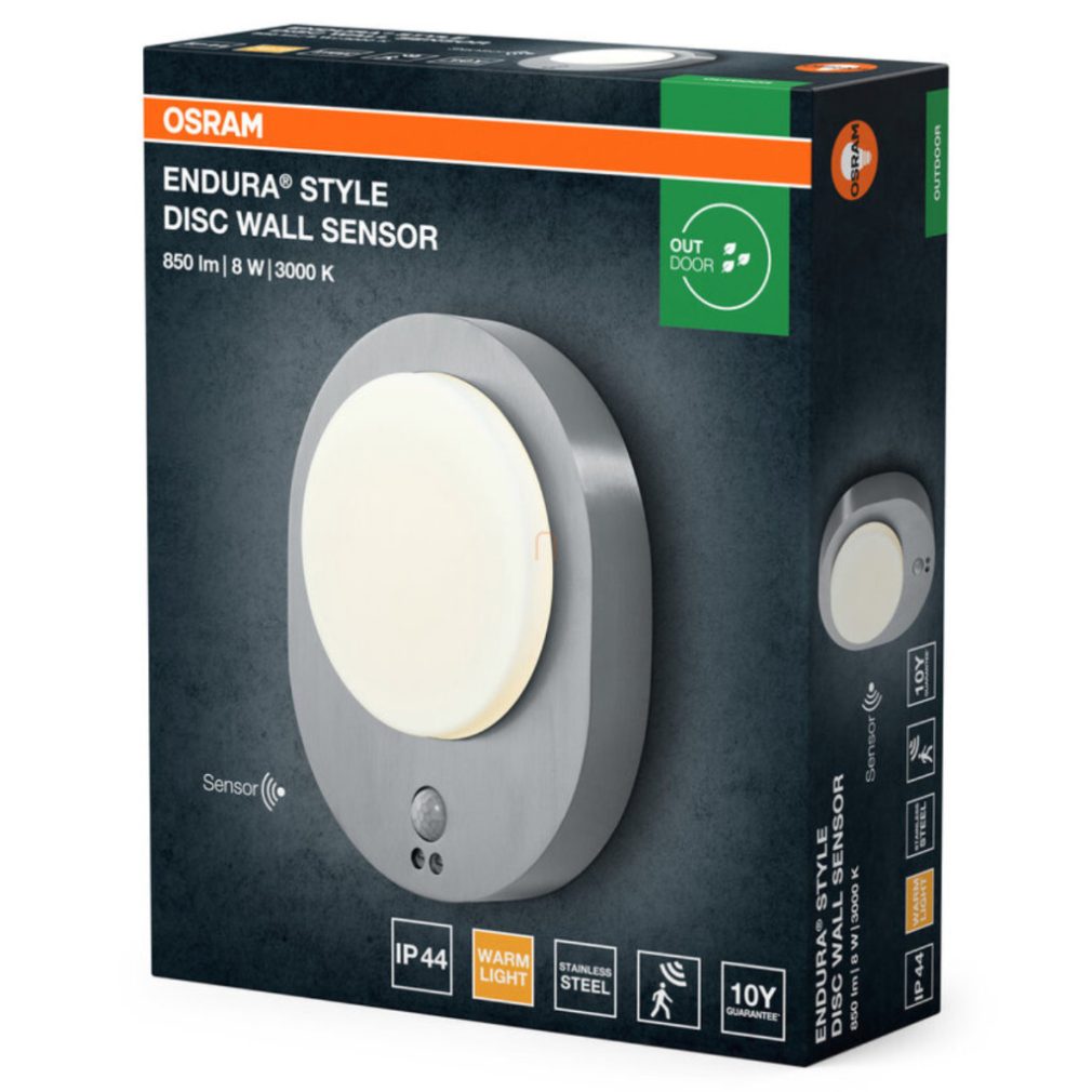 Lampă LED Osram pentru exterior, cu senzor de lumină și mișcare, alb cald, 8 W (Endura Style Disc)