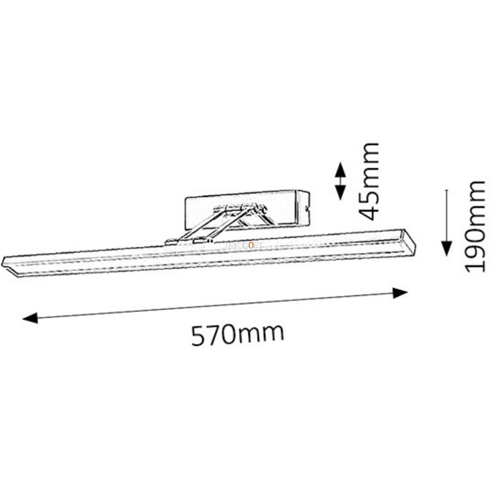 Lampa pentru tablouri Picture Slim Rábalux 3908 LED are un design modern și un cap înclinabil, care permite reglarea precisă a direcției luminii. Corpul de iluminat funcționează cu un modul LED integrat de 12 W, care oferă un flux luminos de 466 lumeni cu o temperatură de culoare albă rece de 4000 Kelvin. Dispozitivul are o carcasă metalică argintie și protecție IP20, fiind potrivit pentru utilizare în interior. Lampa are o lățime de 570 mm, o lungime de 190 mm și o înălțime de 45 mm, iar greutatea sa este de 1,45 kg. Modulul LED nu este înlocuibil și nu poate fi reglat, având o durată de viață medie de 50.000 de ore. Produsul este fabricat de Rábalux și include sursa de lumină.