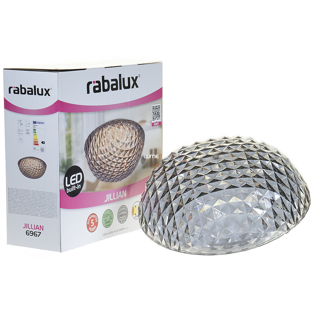 Lampa LED de tavan Jillian Rábalux 6967 are un capac cu efect de sticlă lustruită, care conferă un aspect modern oricărui spațiu de locuit. Corp de iluminat este echipat cu un modul LED integrat de 24 W, care oferă un flux luminos de 2400 lumeni, cu o temperatură de culoare a luminii albă caldă de 3000 K. Produsul are un diametru de 410 mm, o înălțime de 170 mm, este fabricat din metal și plastic și este disponibil în culori transparente și gri. Gradul de protecție IP20 îl face potrivit pentru utilizare în interior. Lampa nu este reglabilă, conține o sursă de lumină și are un soclu pentru modul LED. Dimensiunile ambalajului sunt 41 cm lungime, 41 cm înălțime și 16 cm lățime, iar greutatea este de 1,58 kg. Este fabricat de Rábalux.