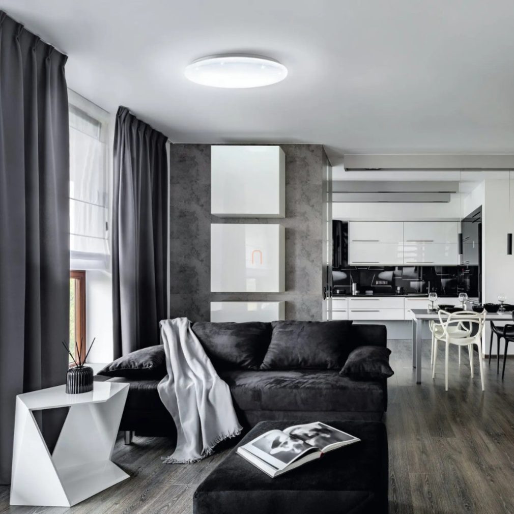 Lampa LED de tavan cu efect strălucitor Giron Eglo 97541 are o putere de 40 W și este realizată într-un stil modern, din oțel alb și plastic. Lampa oferă un flux luminos de 4300 lumeni, iar culoarea luminii poate fi controlată cu o telecomandă, cu o temperatură de culoare între 3000 și 5000 Kelvin, permițându-vă să comutați între nuanțe de alb rece și cald. Modulul LED încorporat garantează un consum energetic eficient, iar lampa are un grad de protecție IP20, fiind potrivită pentru utilizare în interior. Dispozitivul are un diametru de 570 mm, o înălțime de 75 mm și un cod logistic de 97541. Dimensiunile ambalajului sunt: 59 cm lungime, 10 cm lățime și 60 cm înălțime. Produsul este livrat cu o telecomandă care permite reglarea comodă a luminozității și a temperaturii culorii.