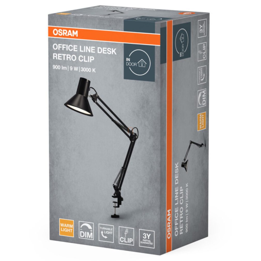 Lampă LED reglabilă pentru birou, montabilă pe masă, 67 cm - Osram Office Line Desk Retro Clip, 3000 K, 393 lm, luminozitate reglabilă, 9 W, cablu de 1,6 metri, 220-240 V