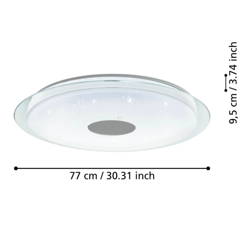 Lampa LED de tavan reglabilă Lanciano Eglo 900006 cu efect strălucitor este fabricată cu tehnologie modernă, conținând un modul LED de 38,1 W cu un flux luminos de 5350 lumeni. Lampa are un diametru de 770 mm și o înălțime de 95 mm, fiind potrivită pentru iluminarea încăperilor mai mari. Temperatura culorii luminii poate fi reglată între 2700 și 6500 Kelvin, permițându-vă să alegeți între lumina albă rece și cea caldă, în funcție de nevoile dvs. Luminozitatea poate fi controlată prin intermediul unei aplicații sau al unei telecomenzi disponibile separat. Lampa are un efect strălucitor și este fabricată din oțel și plastic în culoarea alb-crom. Modulul LED este încorporat, nu poate fi înlocuit și are protecție IP20, fiind potrivit pentru utilizare în interior. Produsul cântărește 6,05 kg, iar dimensiunile ambalajului sunt 81x81x15 cm. Lampa de tavan Lanciano Eglo 900006 a fost dezvoltată pentru a satisface nevoile iluminatului modern al locuințelor și este fabricată de EGLO.