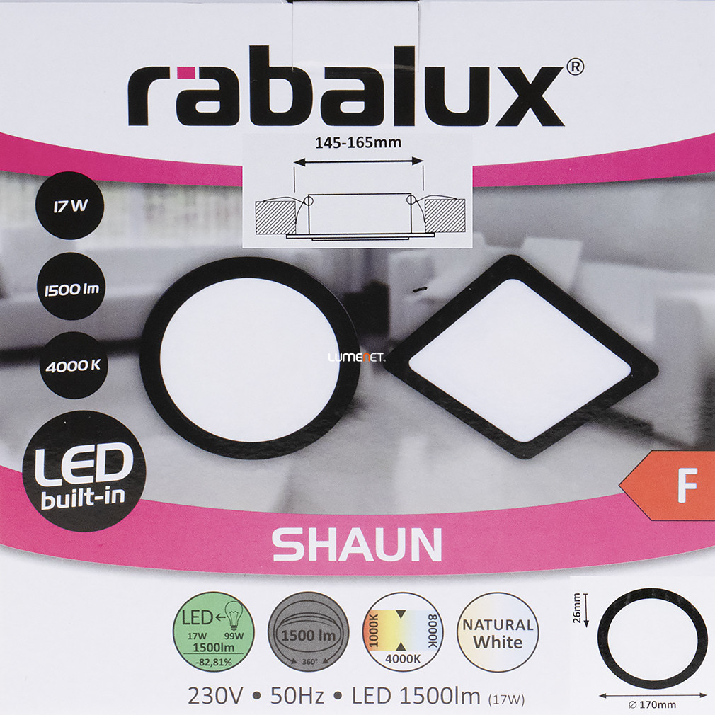 Lampa LED rotundă pentru tavan Shaun Rábalux 2680, cu o putere de 17 W și un flux luminos de 1500 lumeni, oferă o iluminare albă rece, cu o temperatură de culoare de 4000 K. Corpului de iluminat are un diametru de 17 cm și o adâncime de instalare de 26 mm, fiind potrivit pentru instalarea pe suprafață și încastrată. Are un stil funcțional, este de culoare alb-negru, fabricat din plastic durabil, are un grad de protecție IP20 și este proiectat pentru utilizare în interior. Modulul LED încorporat oferă o durată de viață medie lungă de până la 25.000 de ore, eliminând necesitatea înlocuirii sursei de lumină. Lampa oferă o soluție eficientă din punct de vedere energetic pentru iluminatul general în case, birouri sau alte spații interioare.