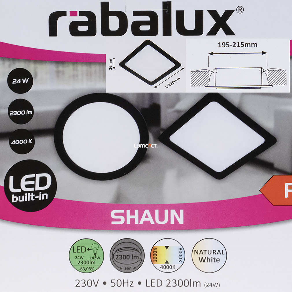 Lampa LED rotundă pentru tavan Shaun Rábalux 2685, cu o putere de 24 W și un flux luminos de 2300 lumeni, asigură o iluminare eficientă în spațiile de locuit. Ea emite o lumină albă rece, cu o temperatură de culoare de 4000 K, ideală pentru medii moderne și funcționale. Lampa poate fi încastrată sau montată la suprafață, ceea ce o face flexibilă pentru utilizarea pe diferite structuri de tavan. Modulul LED oferă o durată de viață lungă de 25.000 de ore, iar lampa are protecție IP20, ceea ce o face potrivită pentru utilizarea în interior. Produsul măsoară 22x22 cm, are o adâncime de instalare de 2,6 cm, este fabricat din plastic durabil și este disponibil în culorile alb și negru. Lampa este fabricată utilizând tehnologia LED de economisire a energiei și conține o sursă de lumină încorporată, fiind astfel gata de utilizare imediată.