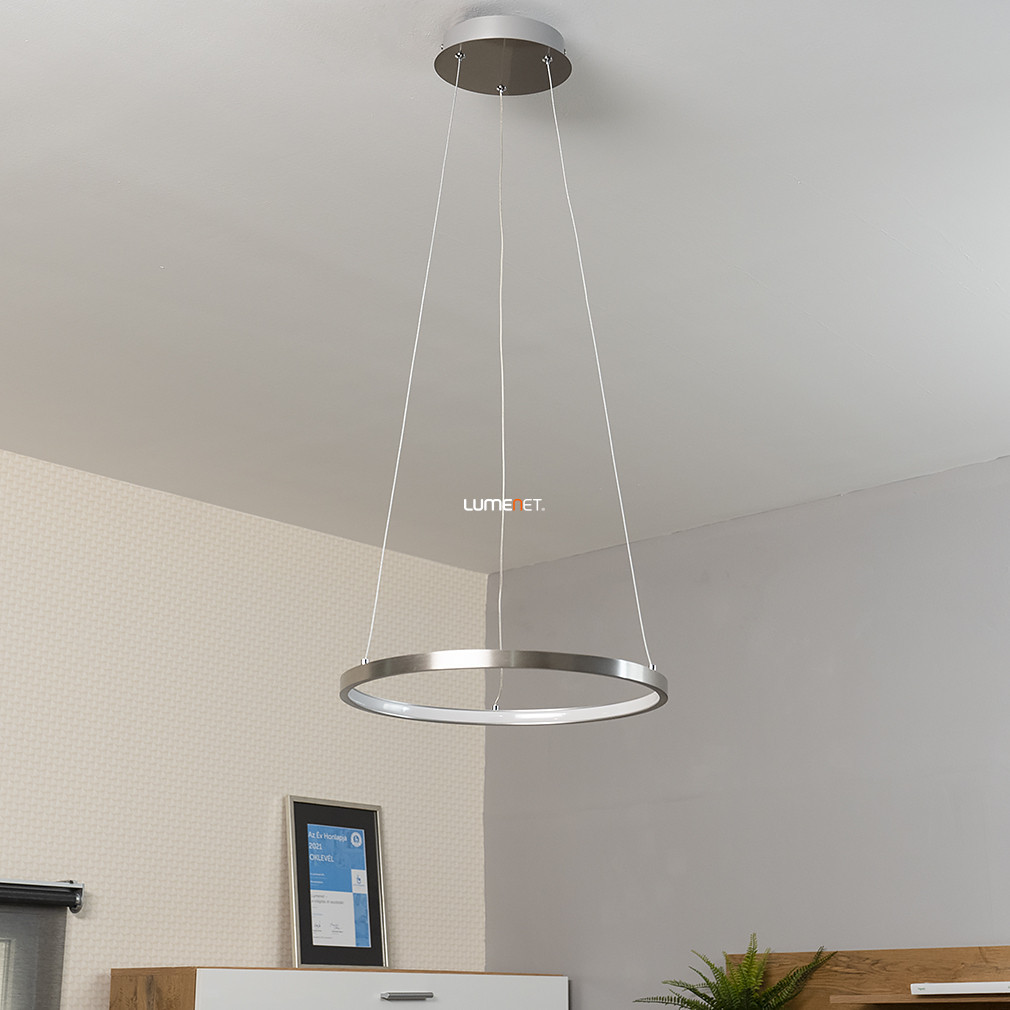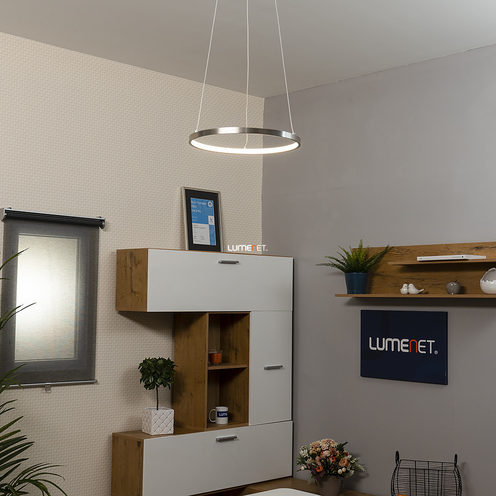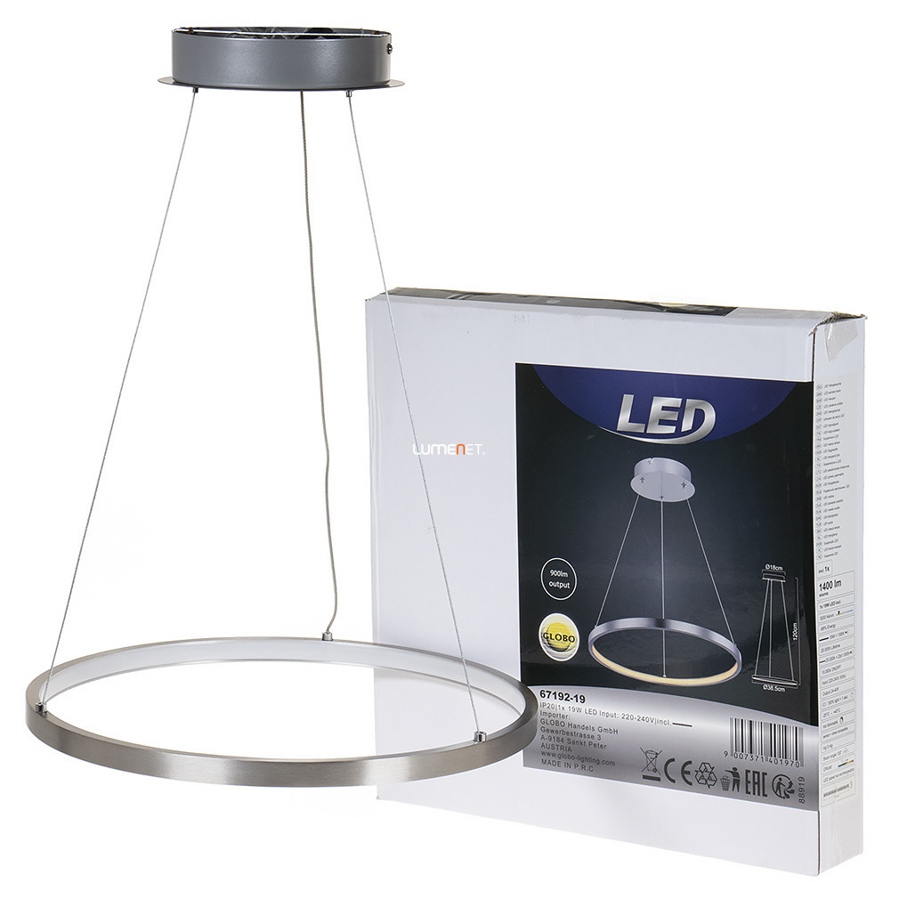 Lampa suspendată Minimal LED 38,5 cm - Ralph Globo 67192-19 este un corp de iluminat modern, cu linii curate, conceput în principal pentru iluminatul interior al spațiilor rezidențiale. Corp de iluminat are un modul LED încorporat de 19 W care emite 900 lumeni de lumină albă caldă cu o temperatură de culoare de 3000 K. Produsul nu este reglabil, modulul LED nu este înlocuibil, iar durata medie de viață este de 20.000 de ore. Lampa are un diametru de 38,5 cm și o înălțime maximă de suspendare de 120 cm, fiind ideală pentru utilizarea ca sursă centrală de lumină într-o sufragerie sau un living. Materialele principale ale lămpii sunt metalul și plasticul, cu o suprafață de culoare nichel și un abajur opal care oferă o lumină uniformă, fără strălucire. Produsul are protecție IP20, deci este potrivit numai pentru utilizare în interior. Dimensiunile ambalajului sunt: 42 cm lungime, 41 cm înălțime, 7 cm lățime și cântărește 1,15 kg. Lampa este fabricată de Globo.