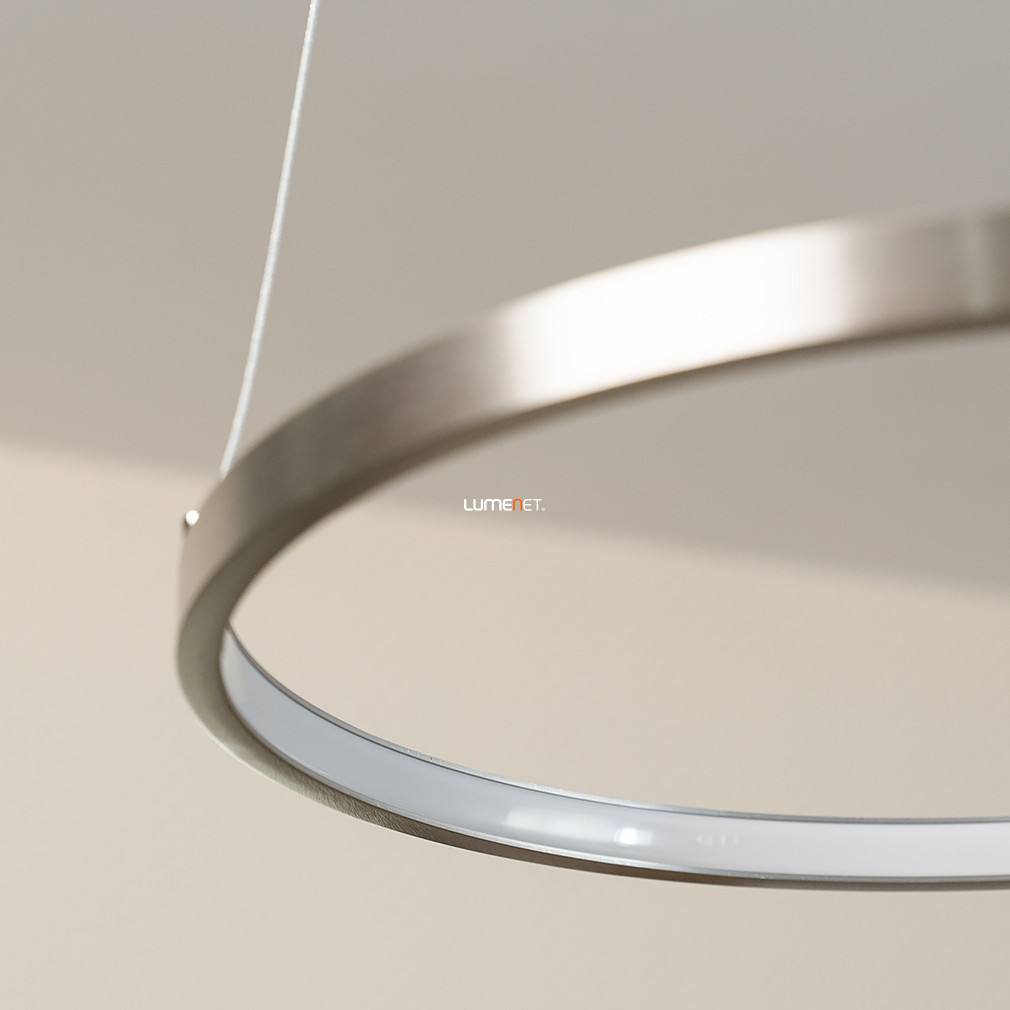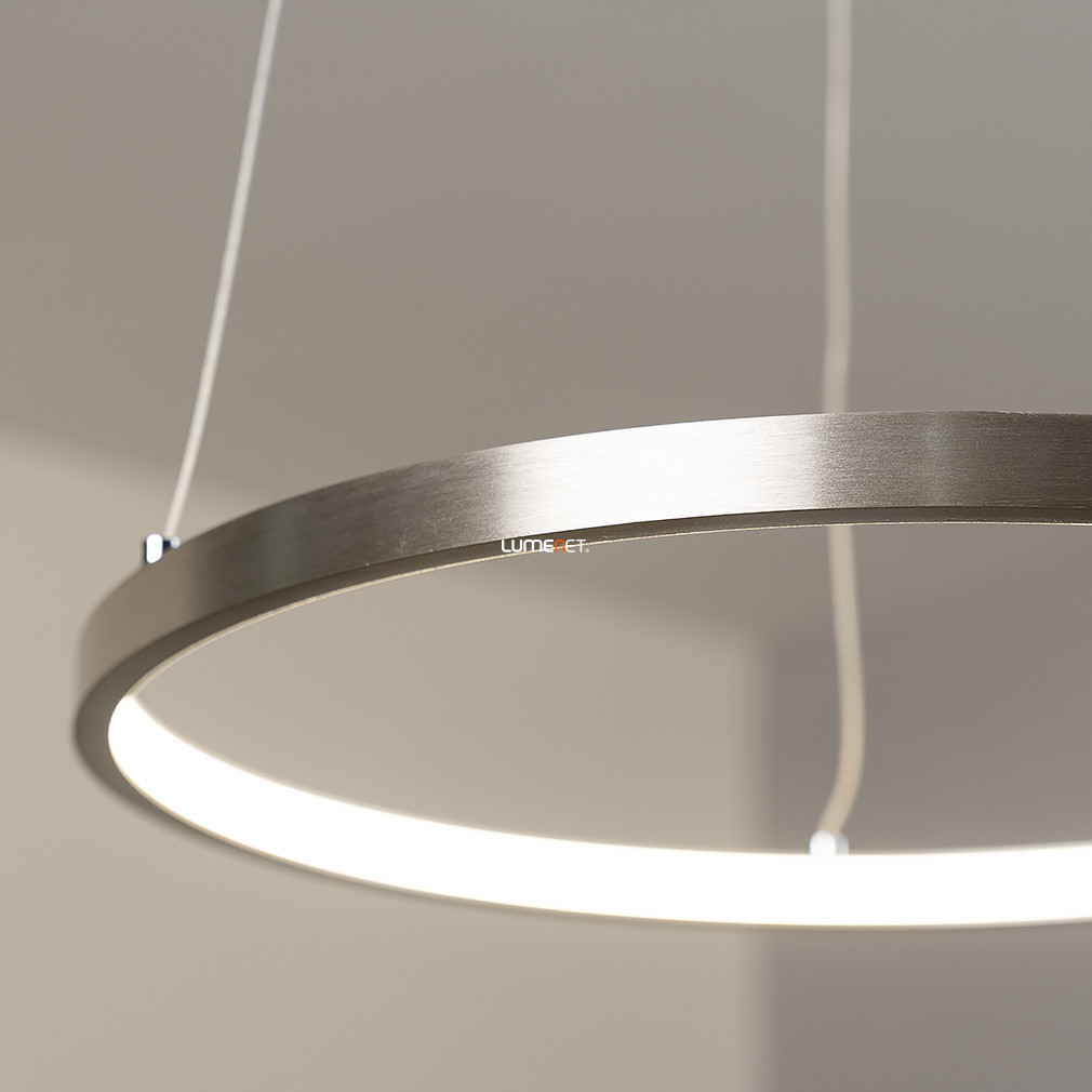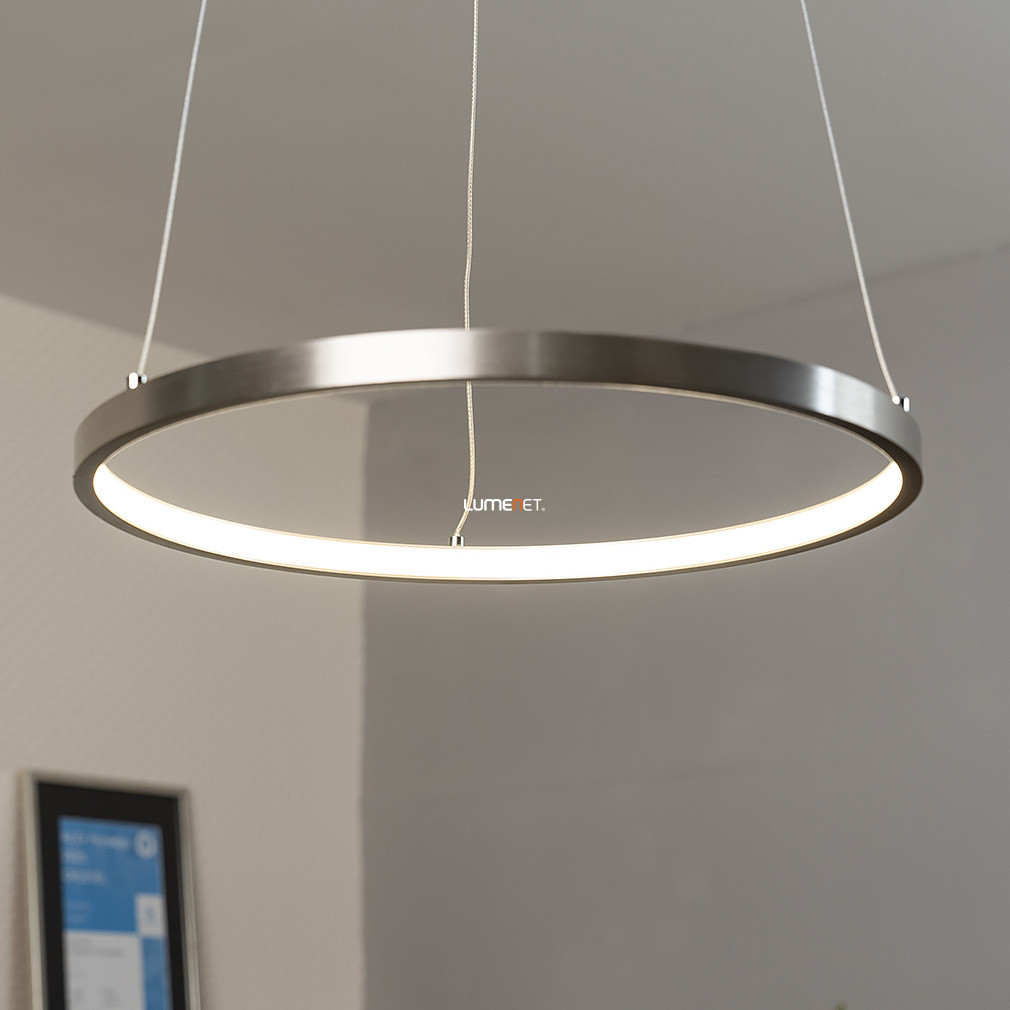 Lampa suspendată Minimal LED 38,5 cm - Ralph Globo 67192-19 este un corp de iluminat modern, cu linii curate, conceput în principal pentru iluminatul interior al spațiilor rezidențiale. Corp de iluminat are un modul LED încorporat de 19 W care emite 900 lumeni de lumină albă caldă cu o temperatură de culoare de 3000 K. Produsul nu este reglabil, modulul LED nu este înlocuibil, iar durata medie de viață este de 20.000 de ore. Lampa are un diametru de 38,5 cm și o înălțime maximă de suspendare de 120 cm, fiind ideală pentru utilizarea ca sursă centrală de lumină într-o sufragerie sau un living. Materialele principale ale lămpii sunt metalul și plasticul, cu o suprafață de culoare nichel și un abajur opal care oferă o lumină uniformă, fără strălucire. Produsul are protecție IP20, deci este potrivit numai pentru utilizare în interior. Dimensiunile ambalajului sunt: 42 cm lungime, 41 cm înălțime, 7 cm lățime și cântărește 1,15 kg. Lampa este fabricată de Globo.