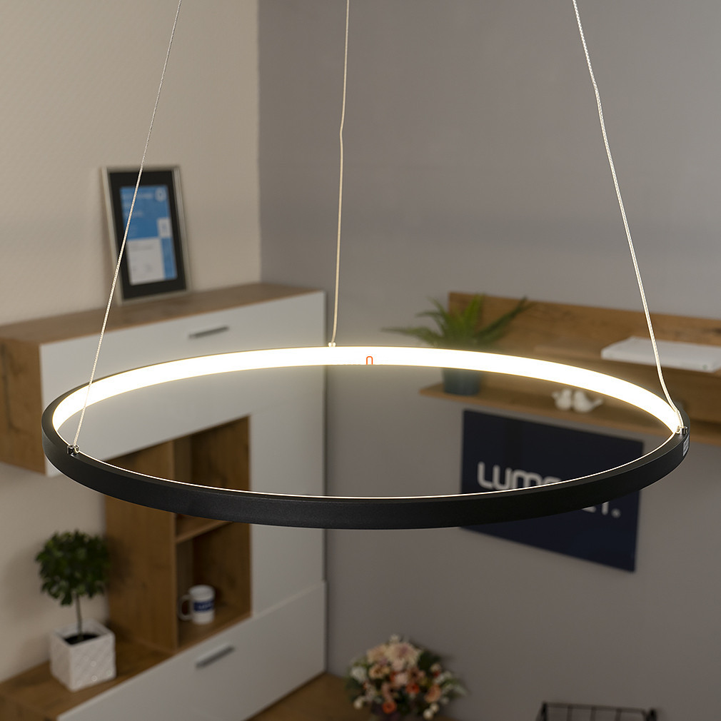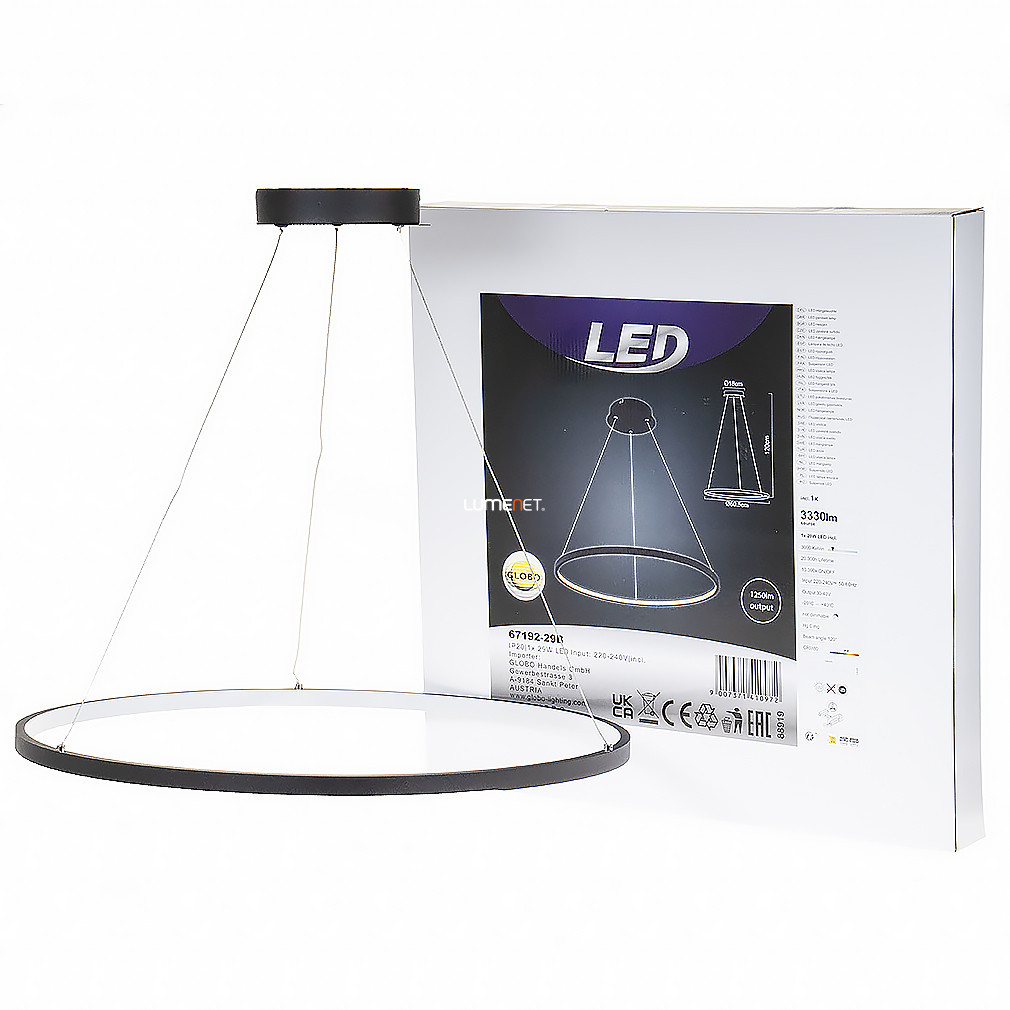 Lampa suspendată LED Ralph Globo 67192-29B de culoare neagră are un design minimalist care se potrivește interioarelor moderne. Lampa are un diametru de 600 mm, o înălțime de 1200 mm, este fabricată din metal și este disponibilă în culoarea negru mat. Modulul LED încorporat are o putere de 29 W și oferă un flux luminos de 1300 lumeni, cu o temperatură de culoare alb cald de 3000 K. Lampa nu este reglabilă, are un modul LED fix și protecție IP20, fiind potrivită pentru utilizare în interior. Produsul cântărește 10,5 kg, iar dimensiunile ambalajului sunt 63x63x7 cm. Producătorul este Globo, iar codul logistic este 67192-29B.