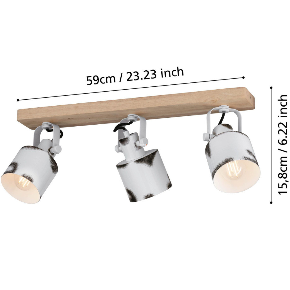 Spotul Kilburn Eglo 43923 are trei socluri E27, permițându-vă să selectați și să înlocuiți liber sursele de lumină. Abajurul este maro și alb, realizat din lemn și oțel, conferind plafonierului un aspect modern și natural. Lungimea totală a lămpii este de 590 mm, iar înălțimea este de 170 mm. Produsul are un grad de protecție IP20 și este potrivit numai pentru utilizare în interior. Dimensiunile ambalajului sunt: 59 cm lungime, 11 cm lățime și 16 cm înălțime. Produsul nu include o sursă de lumină, astfel încât fluxul luminos, culoarea luminii, puterea și temperatura culorii depind de becul ales. Corpul de iluminat cântărește 1,911 kg și este fabricat de EGLO.