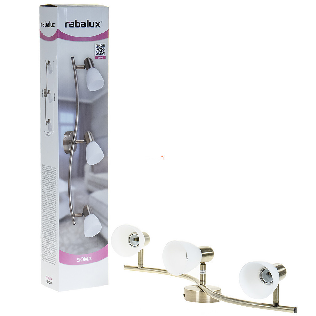 Spotul Soma Rábalux 6308 este proiectat într-un stil modern, cu o combinație de culori bronz și opal. Corpul de iluminat are trei socluri E14, care permit utilizarea surselor de lumină înlocuibile, astfel încât fluxul luminos, culoarea luminii și temperatura culorii să poată fi selectate în funcție de necesități. Materialele principale ale produsului sunt metalul și sticla, care asigură o durată lungă de viață și un aspect elegant. Lampa are un grad de protecție IP20 și este potrivită pentru utilizare în interior. Dimensiunile corpului de iluminat sunt: 80 mm lungime, 600 mm lățime și 180 mm înălțime, cu o greutate de 1,22 kg. Dimensiunile ambalajului sunt: 12 cm lățime, 8 cm lungime și 61 cm înălțime. Corp de iluminat nu conține sursă de lumină și nu are funcție de reglare a intensității luminoase. Fabricat de Rábalux, cod logistic 6308.