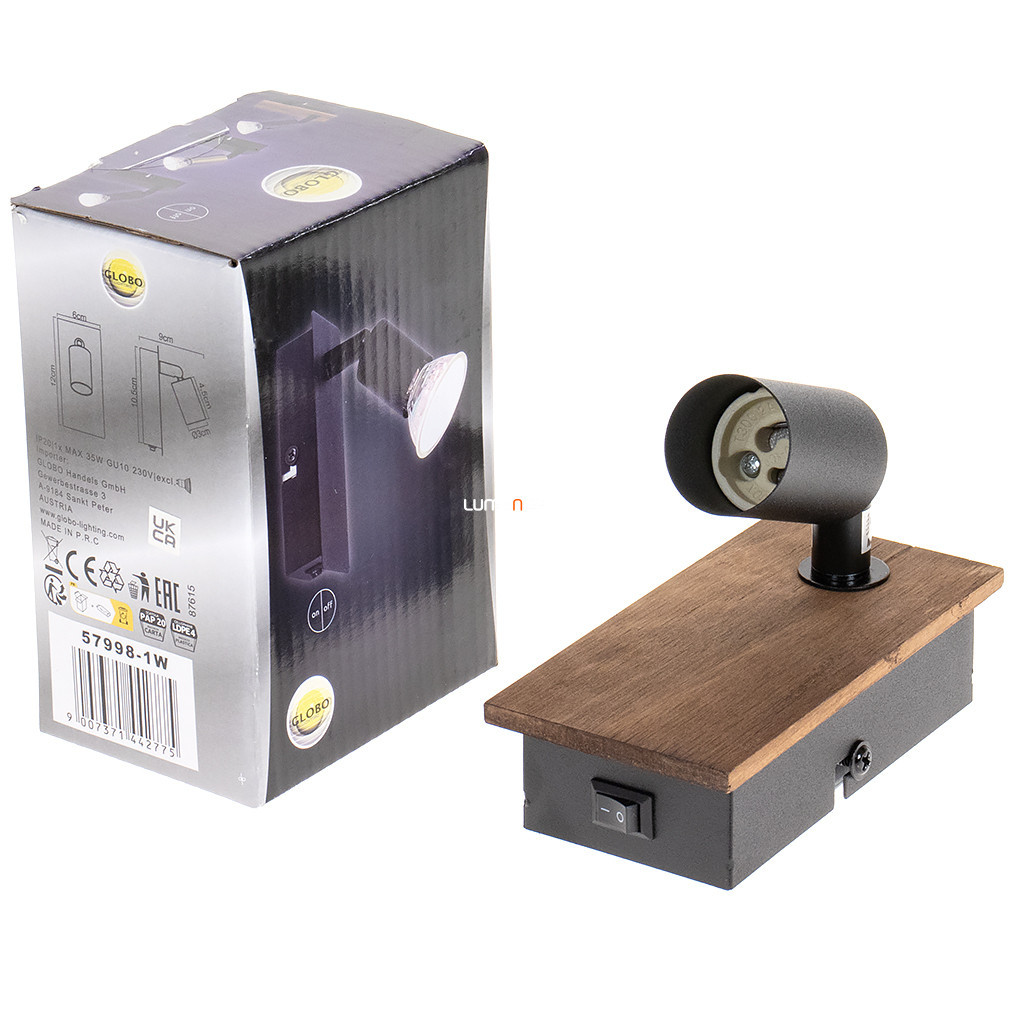 Spotul Drew Globo 57998-1W este un corp de iluminat modern, de culoare neagră mată și cu efect de lemn, cu 1 soclu GU10, conceput pentru a fi utilizat cu surse de lumină înlocuibile. Lampa este controlată de un comutator basculant, ceea ce o face ușor de utilizat. Datorită construcției sale metalice, este durabilă, iar gradul de protecție IP20 o face potrivită pentru utilizare în interior. Dimensiuni: 105 mm lungime, 60 mm lățime, 90 mm înălțime, greutate 0,21 kg. Produsul nu include o sursă de lumină, iar dimensiunile ambalajului sunt 6x8x12 cm. Corpul lămpii este fabricat de Globo.
