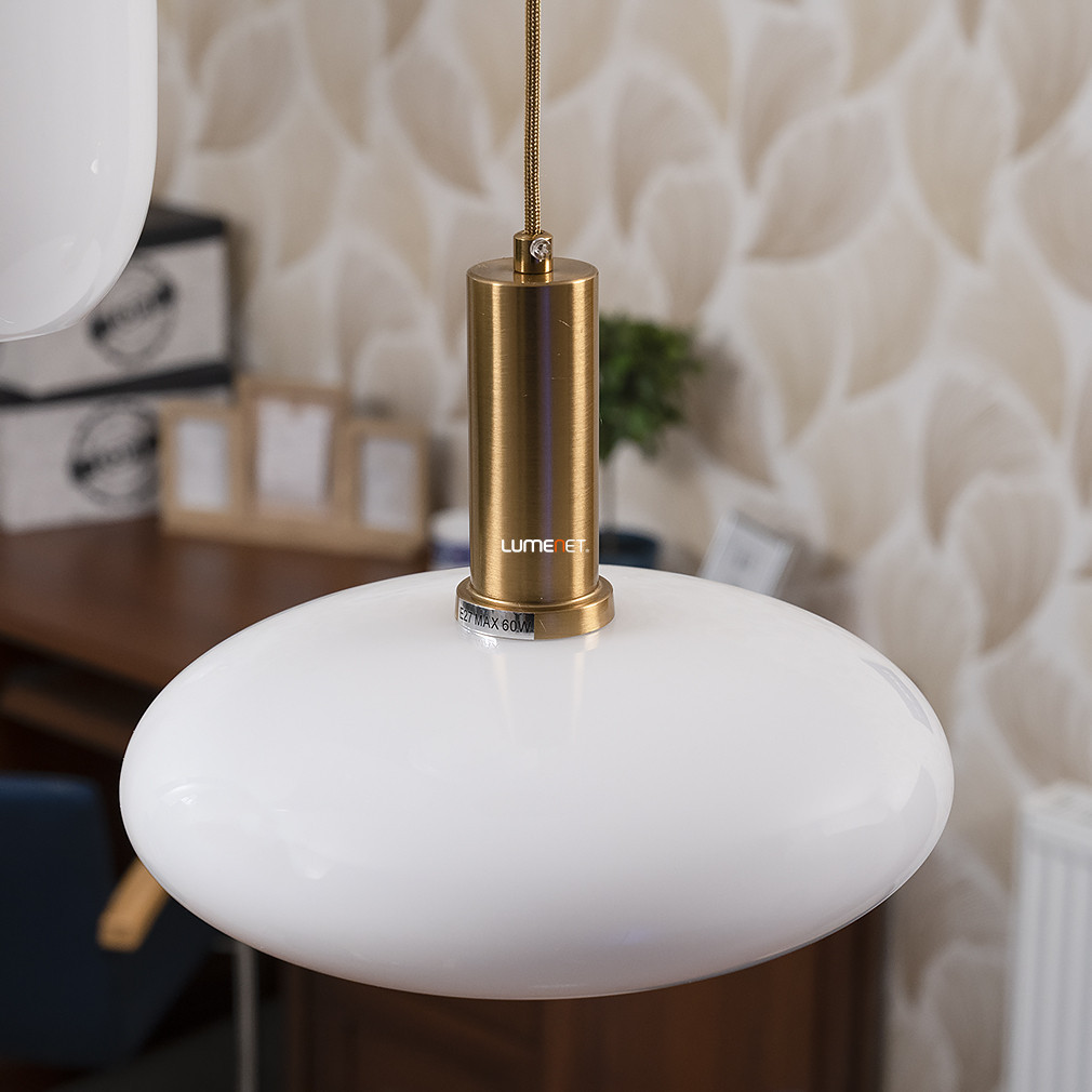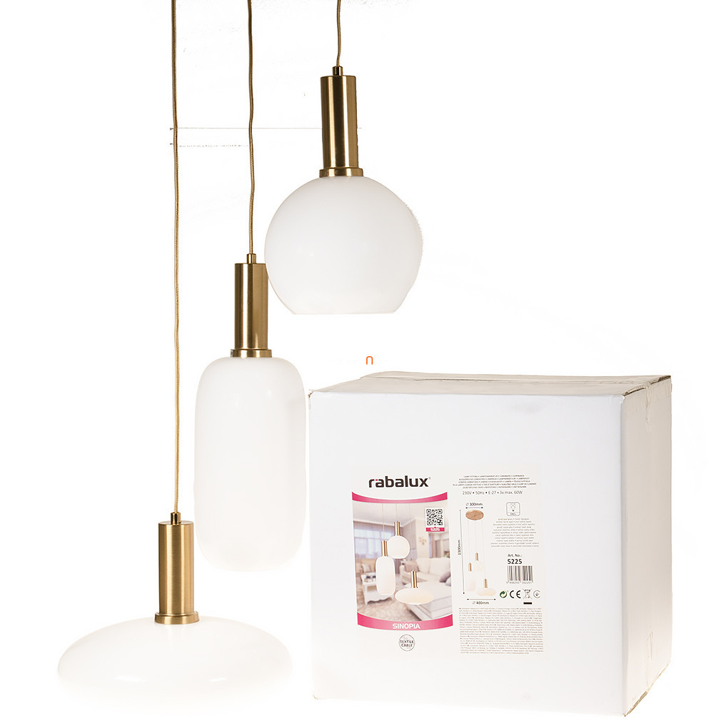 Lampa suspendată Sinopia Rábalux 5225 are trei forme diferite de abajururi din sticlă aurie și albă, care sunt montate pe o structură metalică de susținere. Corpul de iluminat este echipat cu trei socluri E27, care funcționează cu surse de lumină înlocuibile, astfel încât fluxul luminos, temperatura culorii și puterea pot fi ajustate în funcție de cerințele individuale. Lampa nu este reglabilă, are un grad de protecție IP20 și este potrivită pentru utilizare în interior. Are un diametru de 400 mm, o înălțime maximă de 1300 mm și cântărește 4,2 kg. Produsul nu include o sursă de lumină, iar dimensiunile ambalajului sunt 39 x 41 x 40 cm. Aspectul modern al Sinopia Rábalux 5225 se potrivește într-o varietate de spații de locuit și este fabricat de Rábalux.