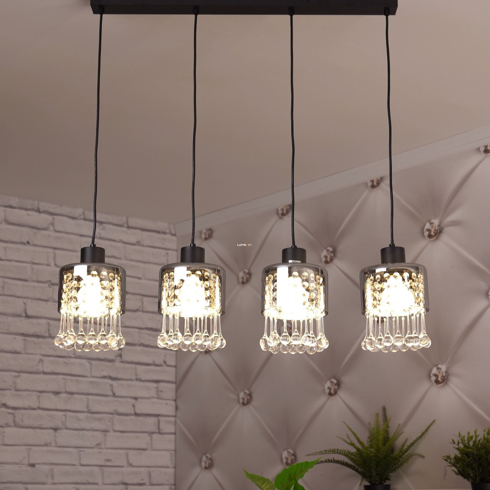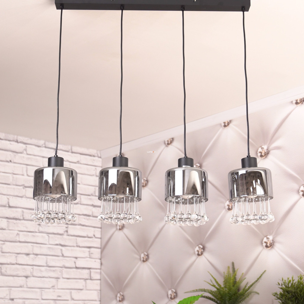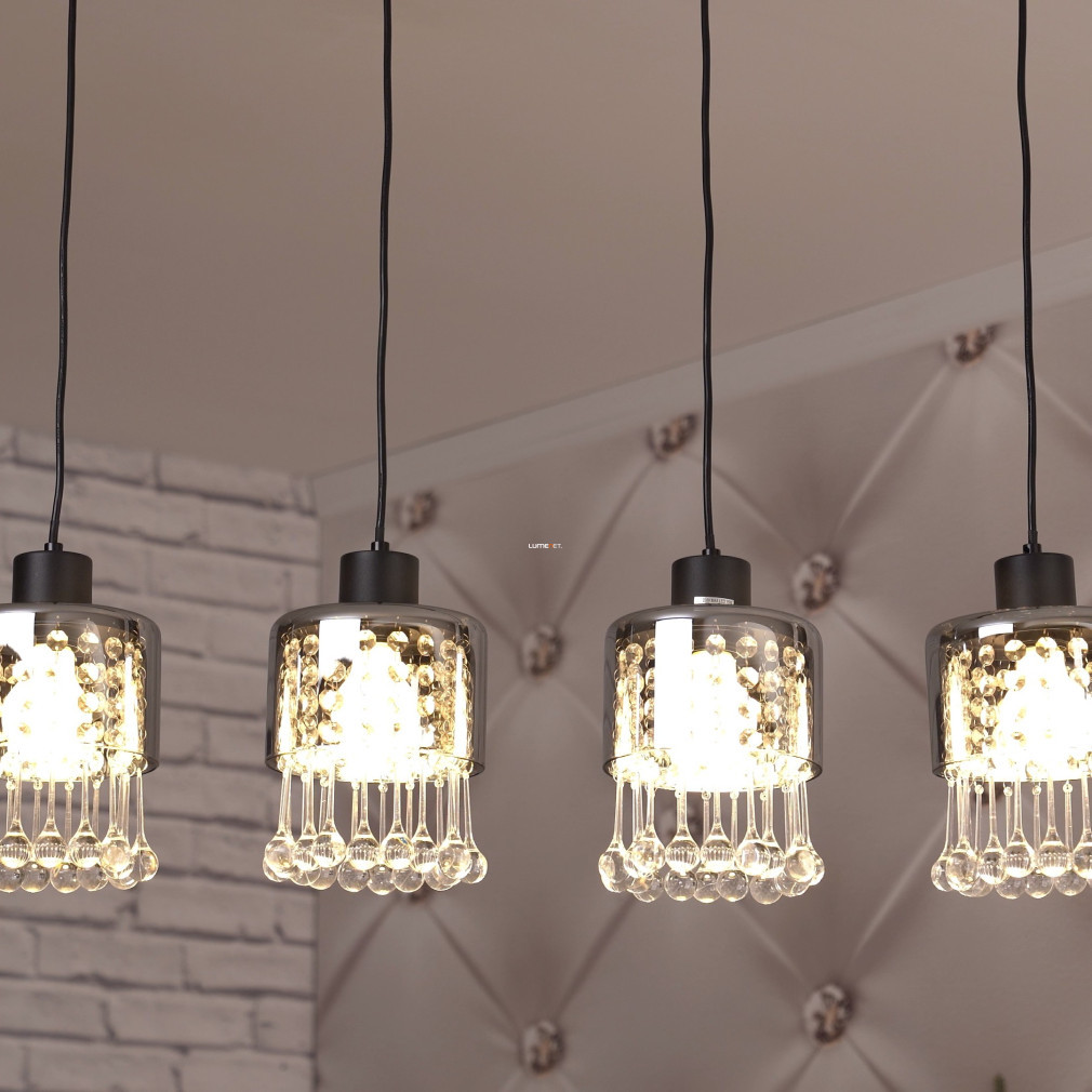 Lampa suspendată Glass Drop cu 4 socluri, Hendry Globo 15884-4H, este o soluție modernă de iluminat pentru locuințe, produsă de Globo. Abajurul este realizat din sticlă și cristal acrilic, cu o suprafață mată de culoare neagră și fumurie. Are patru socluri E27, care pot fi echipate cu surse de lumină înlocuibile, permițând reglarea fluxului luminos, a temperaturii culorii și a puterii, după cum este necesar. Lampa are o lungime de 825 mm, o lățime de 150 mm și o înălțime de 1200 mm. Produsul are protecție IP20, fiind potrivit pentru utilizare în interior. Ambalajul are o lățime de 17 cm, o lungime de 16 cm și o înălțime de 72 cm. Sursele de lumină nu sunt incluse.
