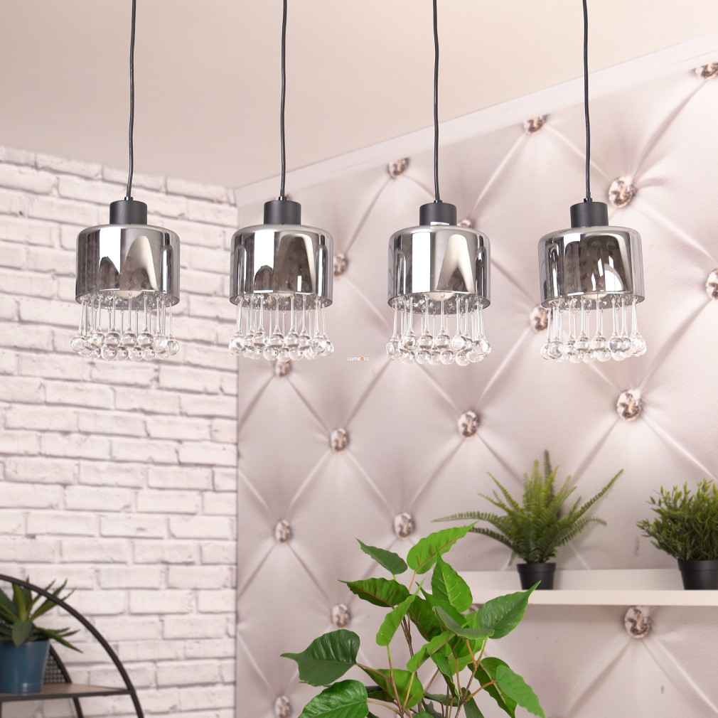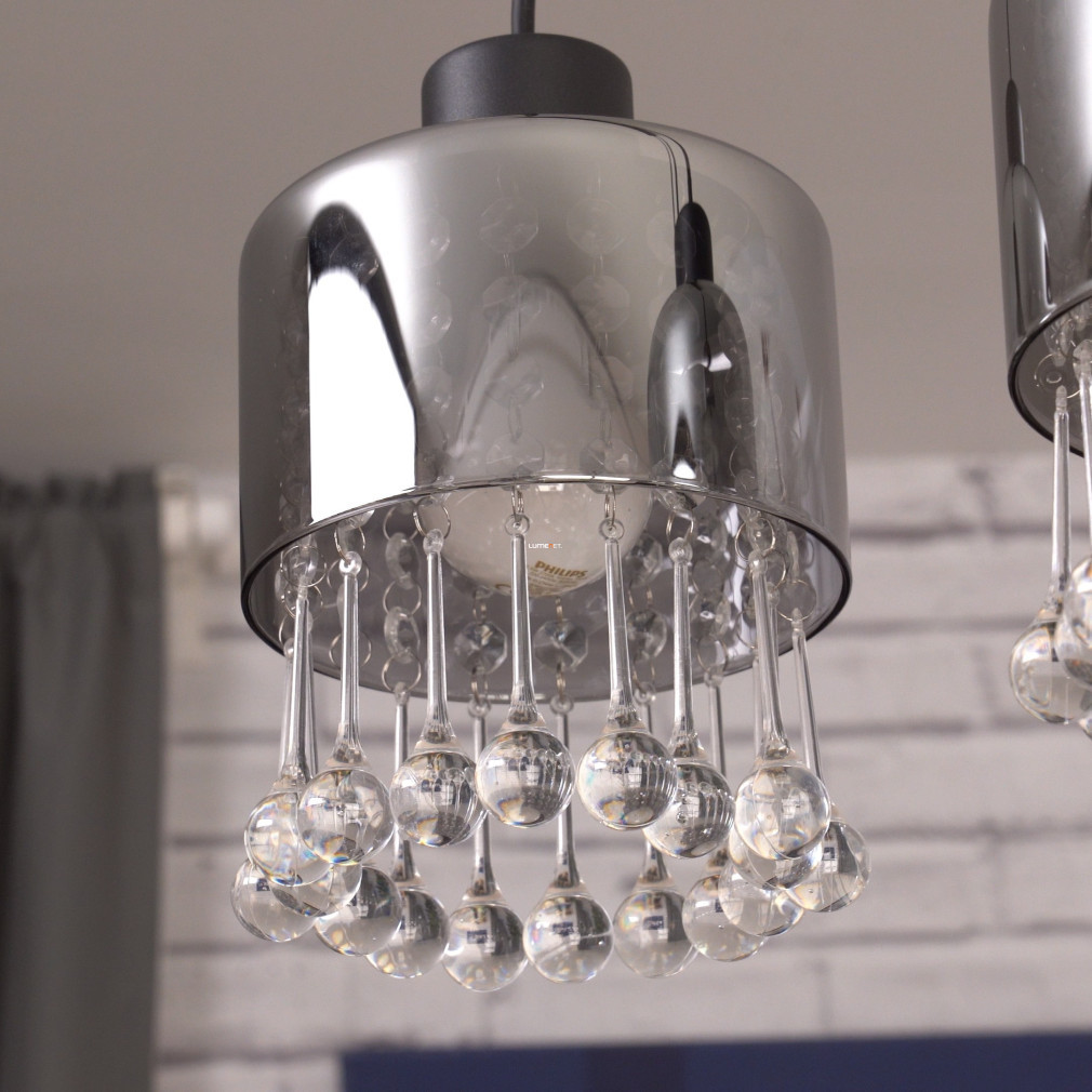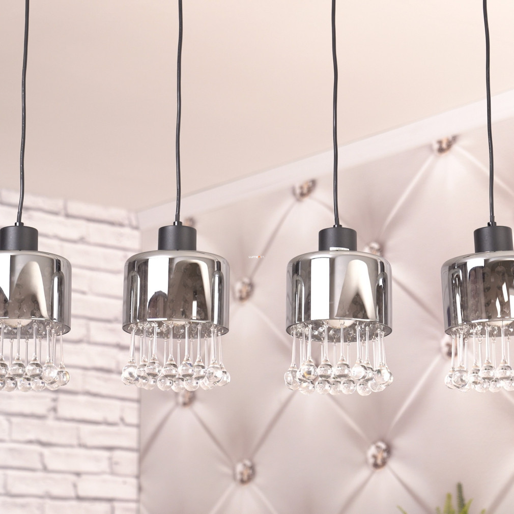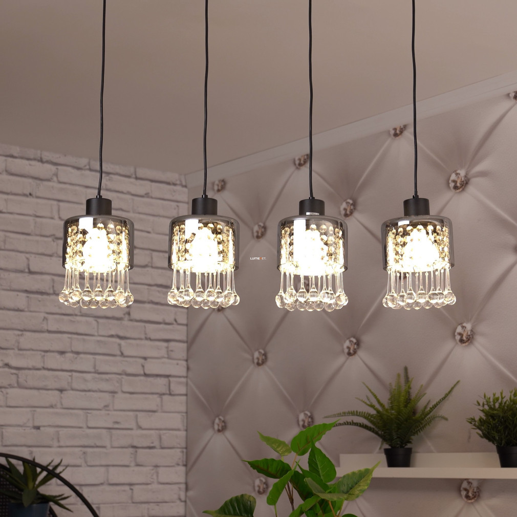 Lampa suspendată Glass Drop cu 4 socluri, Hendry Globo 15884-4H, este o soluție modernă de iluminat pentru locuințe, produsă de Globo. Abajurul este realizat din sticlă și cristal acrilic, cu o suprafață mată de culoare neagră și fumurie. Are patru socluri E27, care pot fi echipate cu surse de lumină înlocuibile, permițând reglarea fluxului luminos, a temperaturii culorii și a puterii, după cum este necesar. Lampa are o lungime de 825 mm, o lățime de 150 mm și o înălțime de 1200 mm. Produsul are protecție IP20, fiind potrivit pentru utilizare în interior. Ambalajul are o lățime de 17 cm, o lungime de 16 cm și o înălțime de 72 cm. Sursele de lumină nu sunt incluse.
