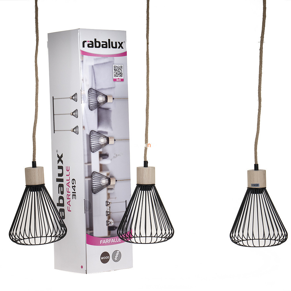 Lampa suspendată cu cablu din cânepă Farfalle Rábalux 3149 are trei socluri E27 care pot fi utilizate cu surse de lumină înlocuibile. Abajurul este realizat dintr-o combinație de metal negru și materiale din lemn și are un abajur din grilaj. Produsul este realizat în stil scandinav, are o lungime de 800 mm, o lățime de 180 mm și o înălțime de 1200 mm, cu un grad de protecție IP20. Dimensiunile ambalajului sunt 81x19x19 cm, iar lampa cântărește 2,3 kg. Sursa de lumină nu este inclusă, astfel încât fluxul luminos, temperatura culorii și puterea dorite pot fi selectate liber. Produsul este fabricat de Rábalux și are codul logistic 3149.