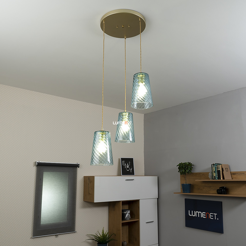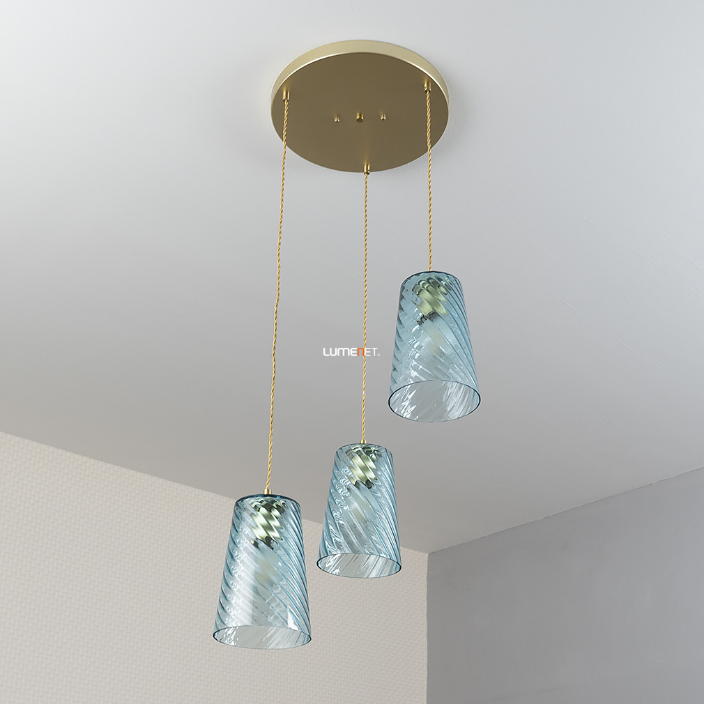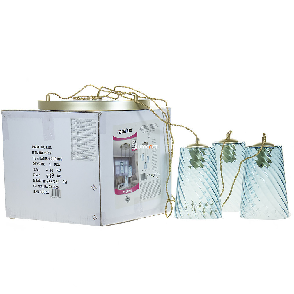 Azurine Rábalux 5227 este o lampă suspendată caracterizată printr-un cablu textil de culoare aurie și un abajur din sticlă albastră. Corpul de iluminat are trei socluri E27, care pot fi echipate cu surse de lumină înlocuibile. Înălțimea totală a lămpii este de 1750 mm, diametrul său este de 420 mm, iar greutatea este de 4,3 kg. Utilizarea sticlei și a metalului asigură durabilitate și un aspect de înaltă calitate, iar gradul de protecție IP20 o face potrivită pentru utilizare în interior. Produsul nu include o sursă de lumină, astfel încât fluxul luminos, temperatura culorii și puterea depind de tipul de bec instalat. Dimensiunile ambalajului sunt 38 x 38 x 33 cm. Lampa nu este reglabilă și este fabricată de Rábalux.