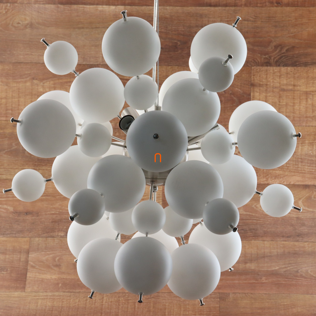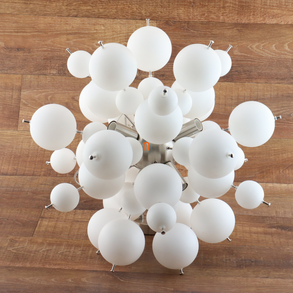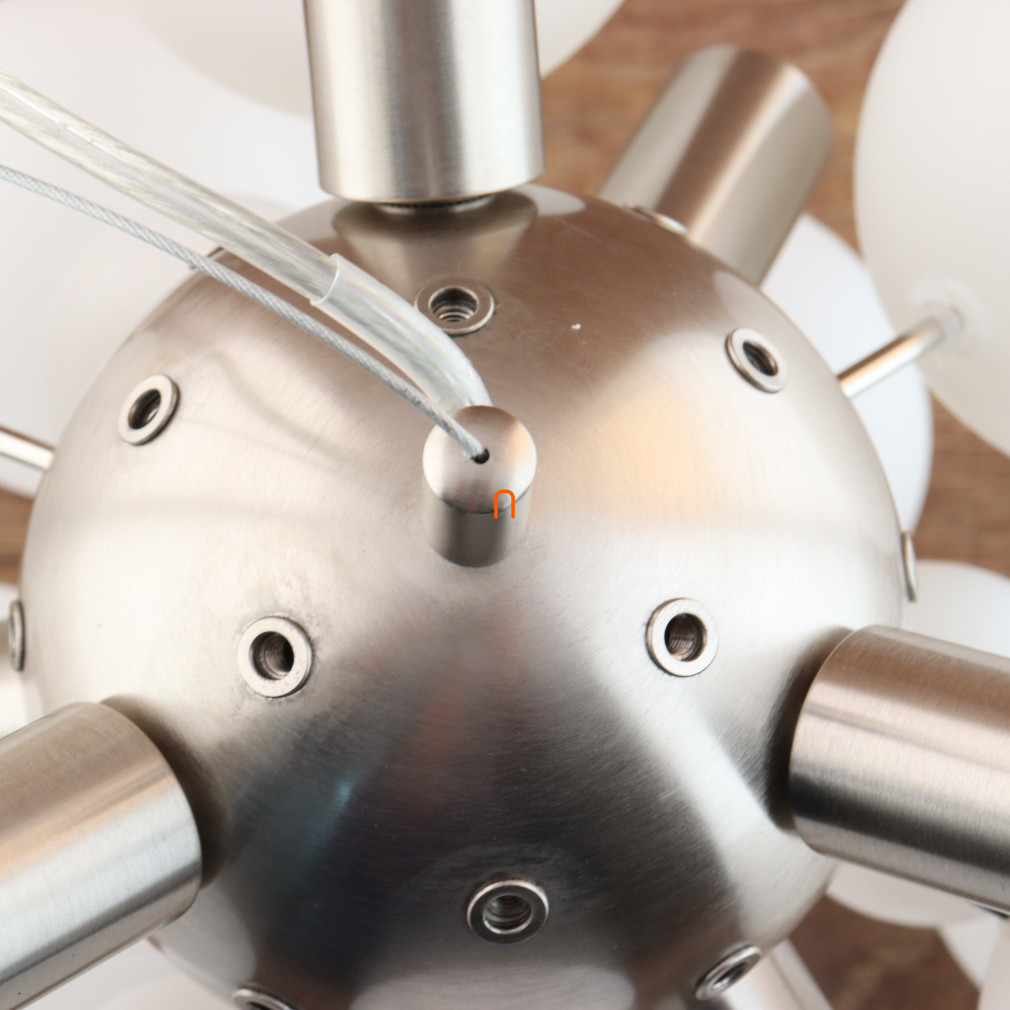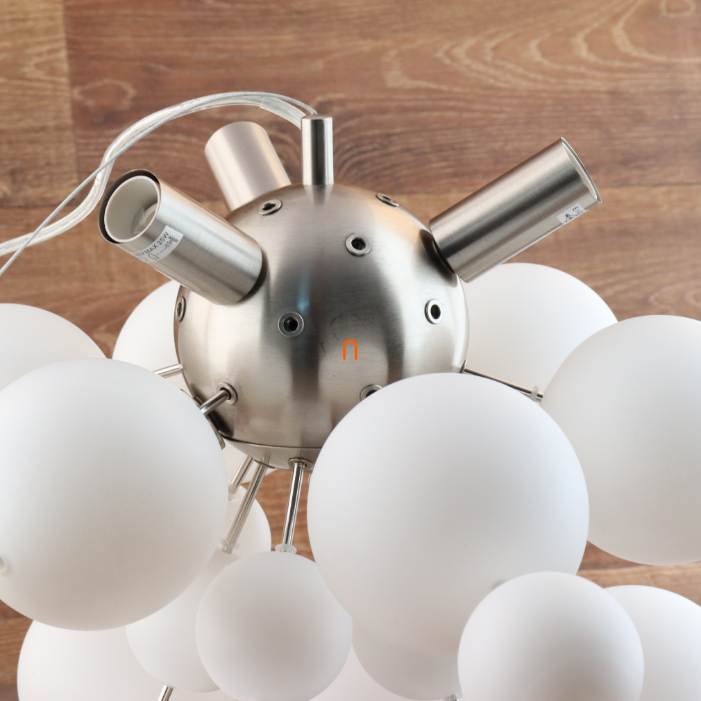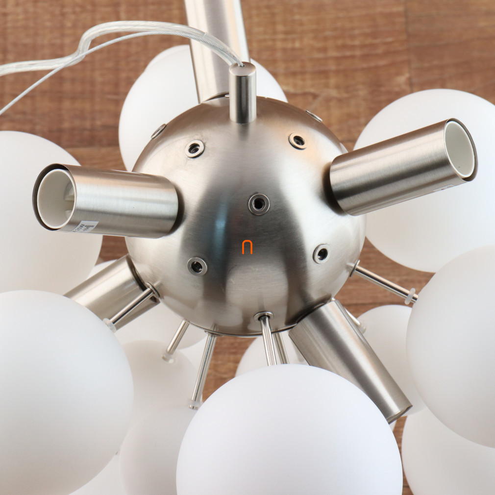 Lampa suspendată Udo Globo 15633HO este un corp de iluminat modern cu șase socluri E14, ceea ce o face compatibilă cu o varietate de surse de lumină înlocuibile. Materialele principale ale lămpii sunt metalul și sticla, cu un finisaj din nichel și opal pentru un aspect elegant. Globurile din sticlă albă asigură o distribuție uniformă a luminii, iar lampa are un diametru total de 550 mm și o înălțime de 1200 mm. Produsul funcționează la o tensiune nominală de 230 V și are un grad de protecție IP20, fiind potrivit pentru utilizare în interior. Corp de iluminat nu include o sursă de lumină, permițând utilizatorului să aleagă liber temperatura de culoare și puterea dorite. Dimensiunile ambalajului sunt de 44 cm lățime, 26 cm lungime și 67 cm înălțime, iar produsul cântărește 4,27 kg. Producătorul este Globo.