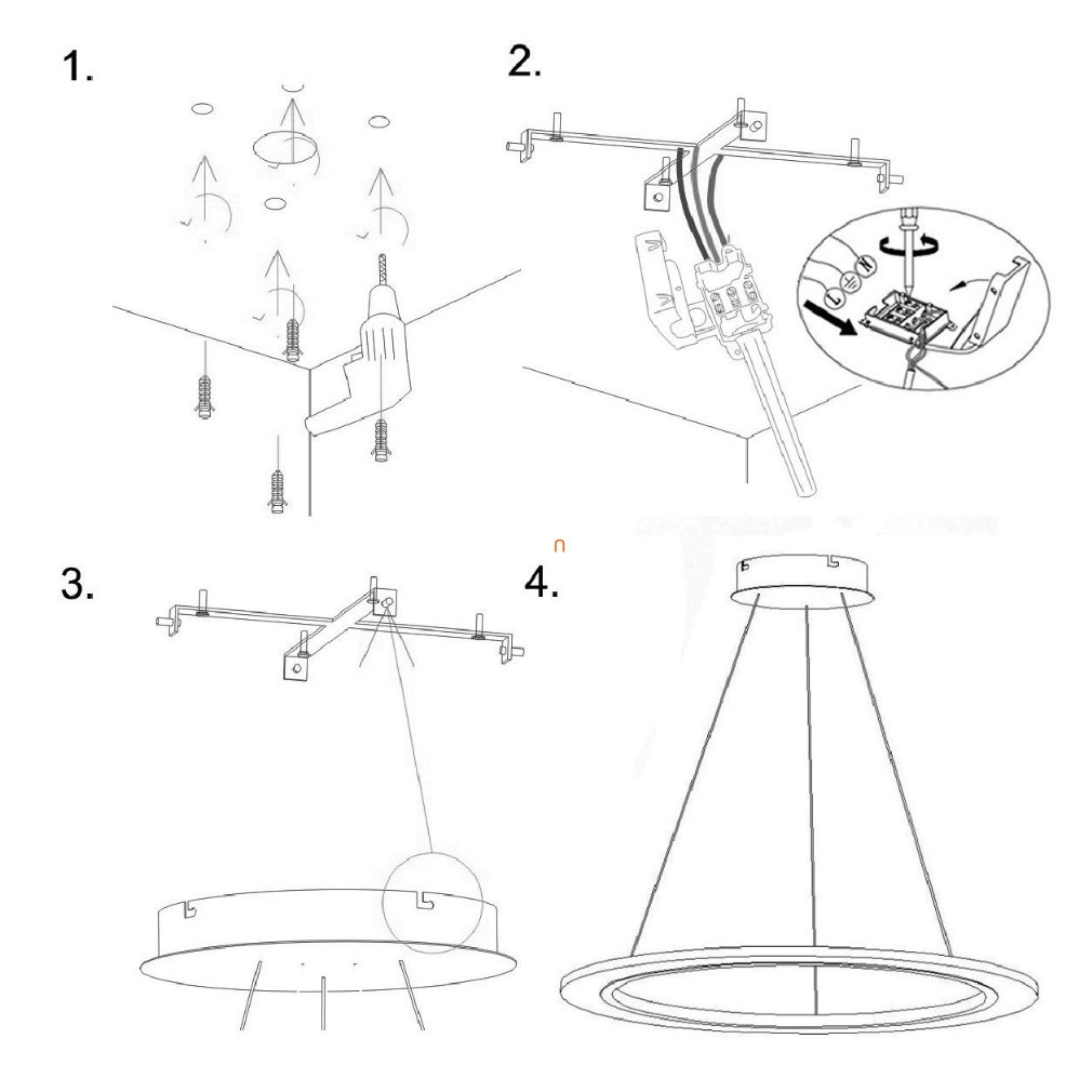 Majoritatea lămpilor montate pe tavan sunt prevăzute cu un cablu de 110 cm și un element de acoperire (cunoscut sub denumirea de „rozeta de tavan”) care ascunde conexiunea la rețeaua electrică și elementul de montare. Lungimea suspensiei poate fi scurtată folosind șurubul de pe elementul de acoperire al tavanului, dacă utilizatorul dorește să atârne lampa la o lungime mai mică de 110 cm în cameră. Cablul în exces poate fi ascuns sub elementul de acoperire al tavanului (fără reinstalare) sau, dacă spațiul este limitat, poate fi tăiat și reconectat la blocul terminal într-un mod estetic plăcut. Acest lucru trebuie făcut cu alimentarea deconectată sau cu ajutorul unui electrician calificat.