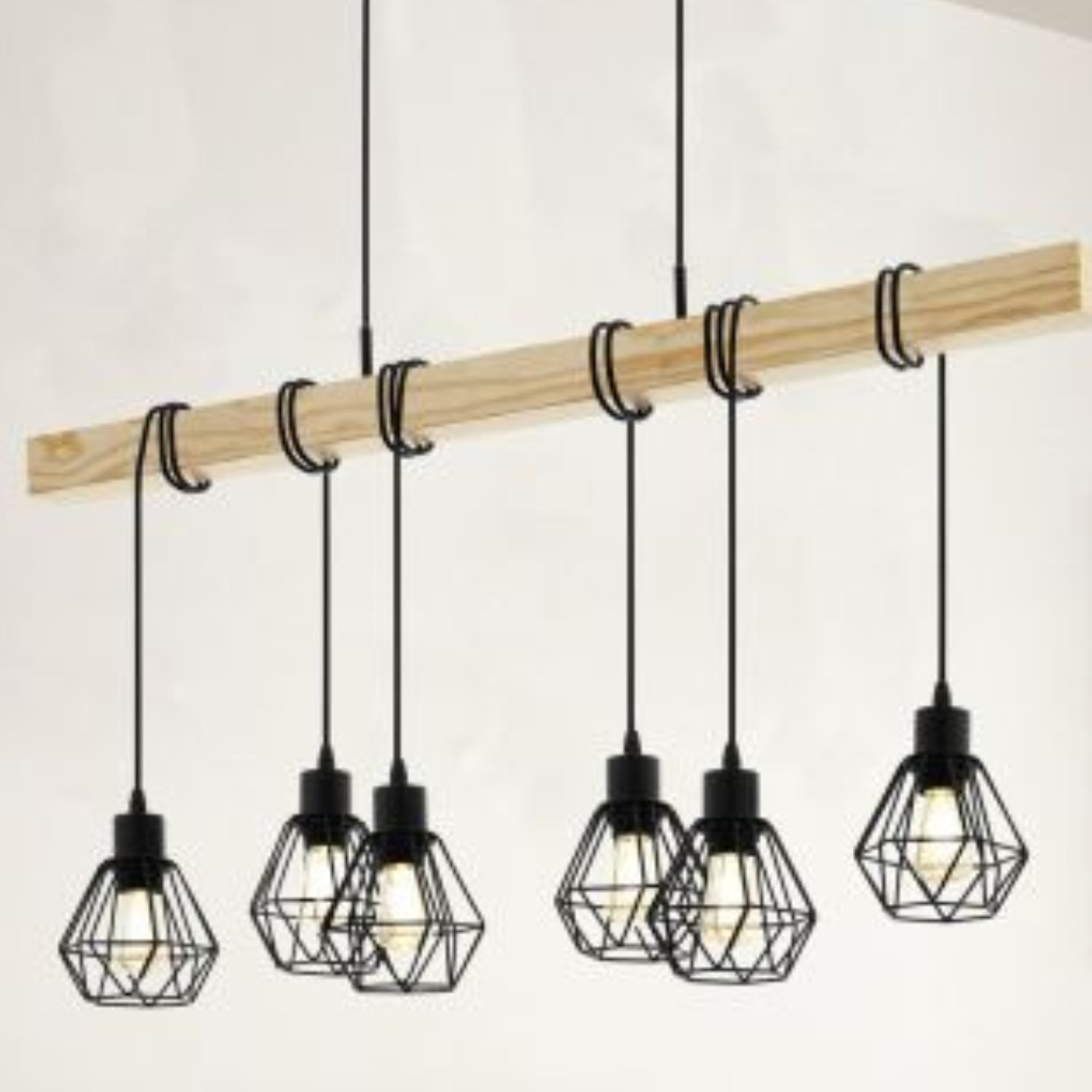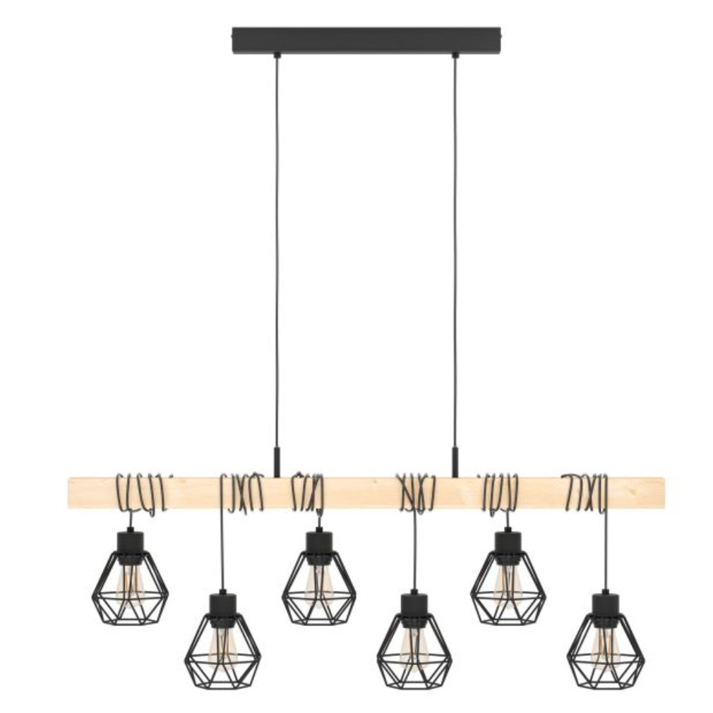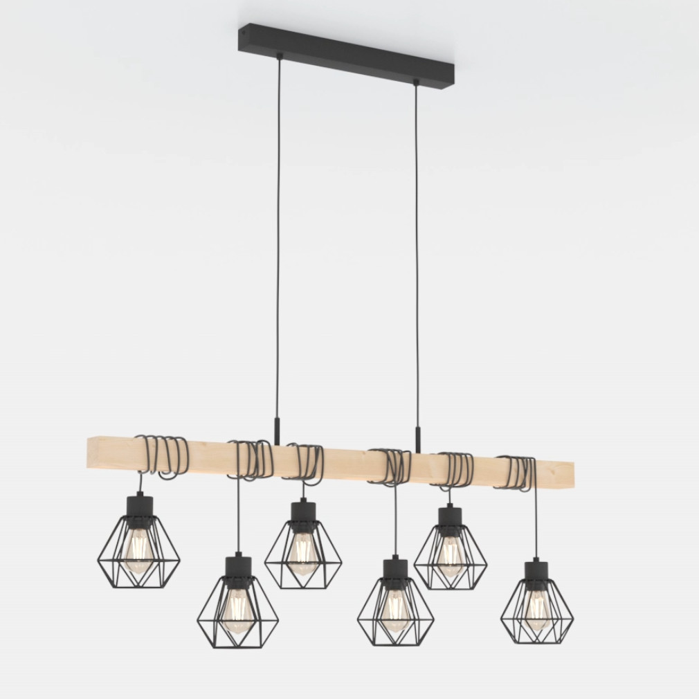 Lampă suspendată cu șase socluri, negru și culoarea lemnului - Townshend Eglo 44076