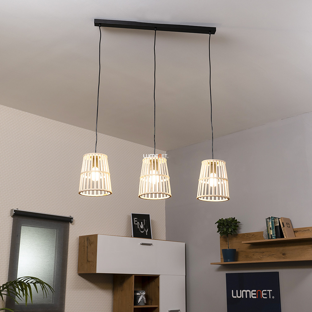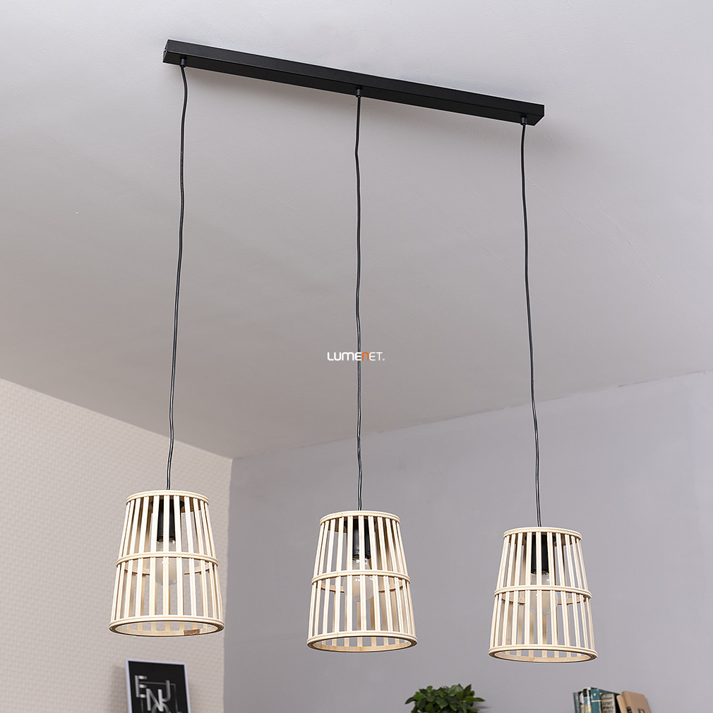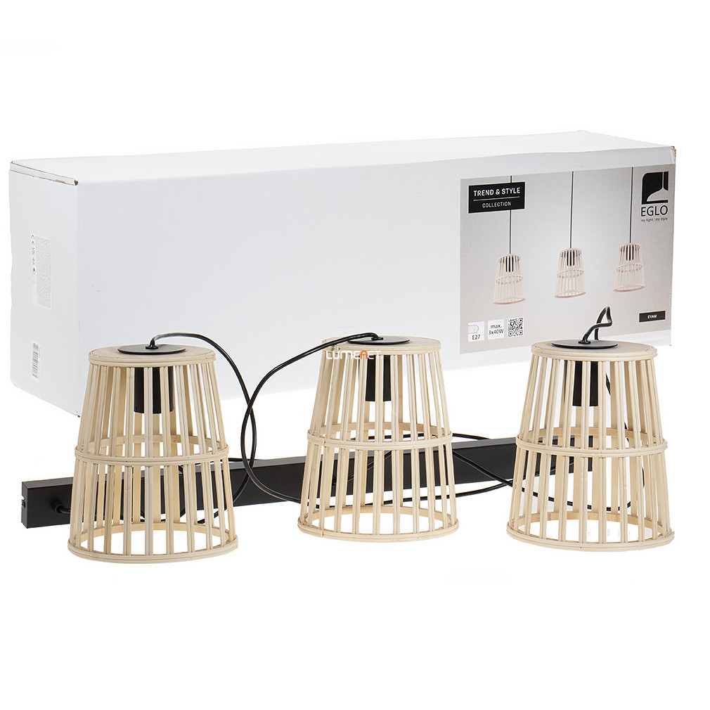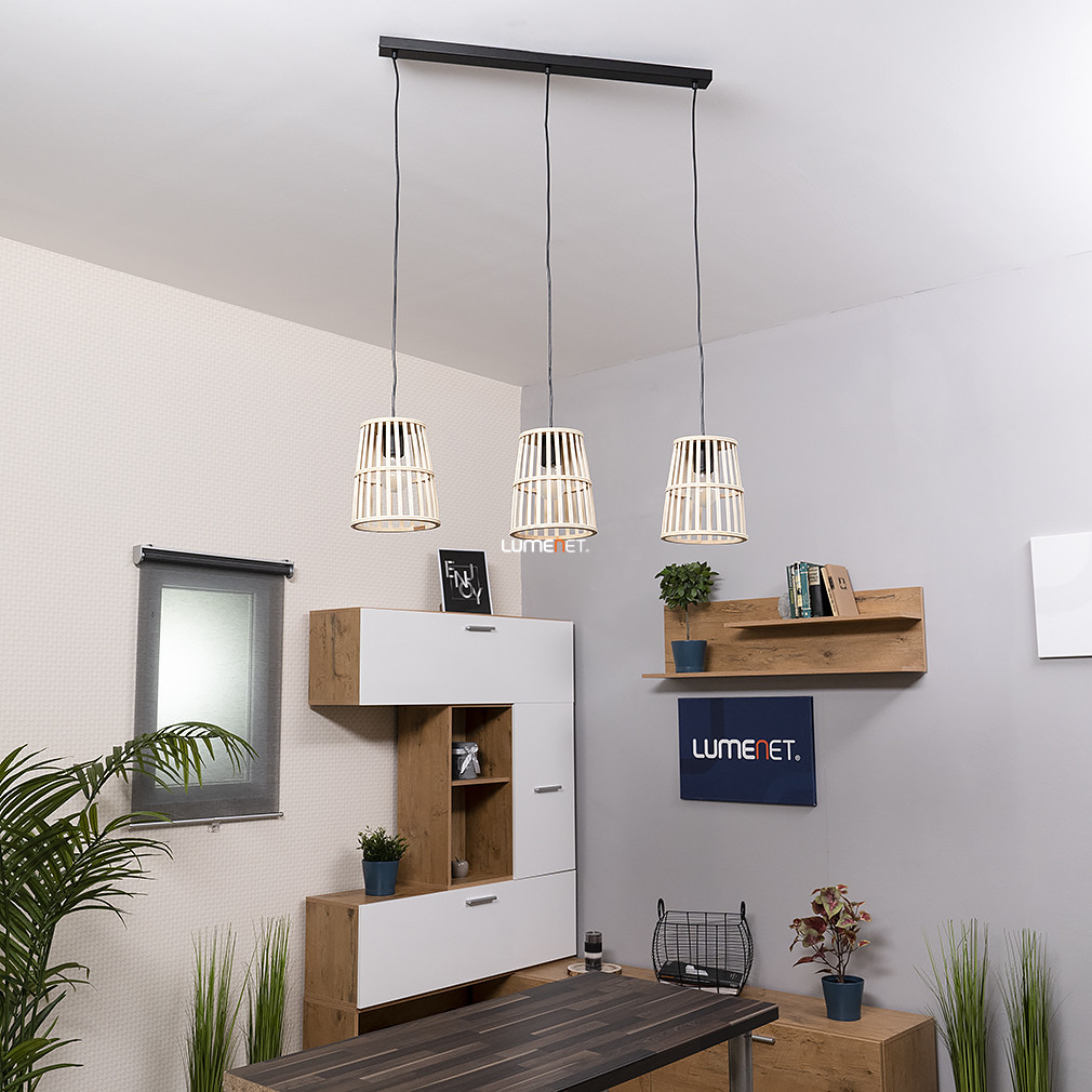 Lampa suspendată Eyam Eglo 33202 din lemn în culoare naturală oferă un aspect modern în stil etnic. Abajurul este realizat dintr-o combinație de oțel și lemn în culori negru și maro. Produsul are trei socluri E27, care pot fi echipate cu surse de lumină înlocuibile. Fluxul luminos, temperatura culorii și puterea depind de becurile utilizate. Lampa nu este reglabilă și are protecție IP20, fiind potrivită pentru utilizare în interior. Dimensiunile lămpii sunt: 890 mm lungime, 190 mm lățime și 1110 mm înălțime, cu o greutate de 3,04 kg. Dimensiunile ambalajului sunt: 80 mm lățime, 25 mm lungime și 20 mm înălțime. Produsul nu include o sursă de lumină și este fabricat de EGLO.