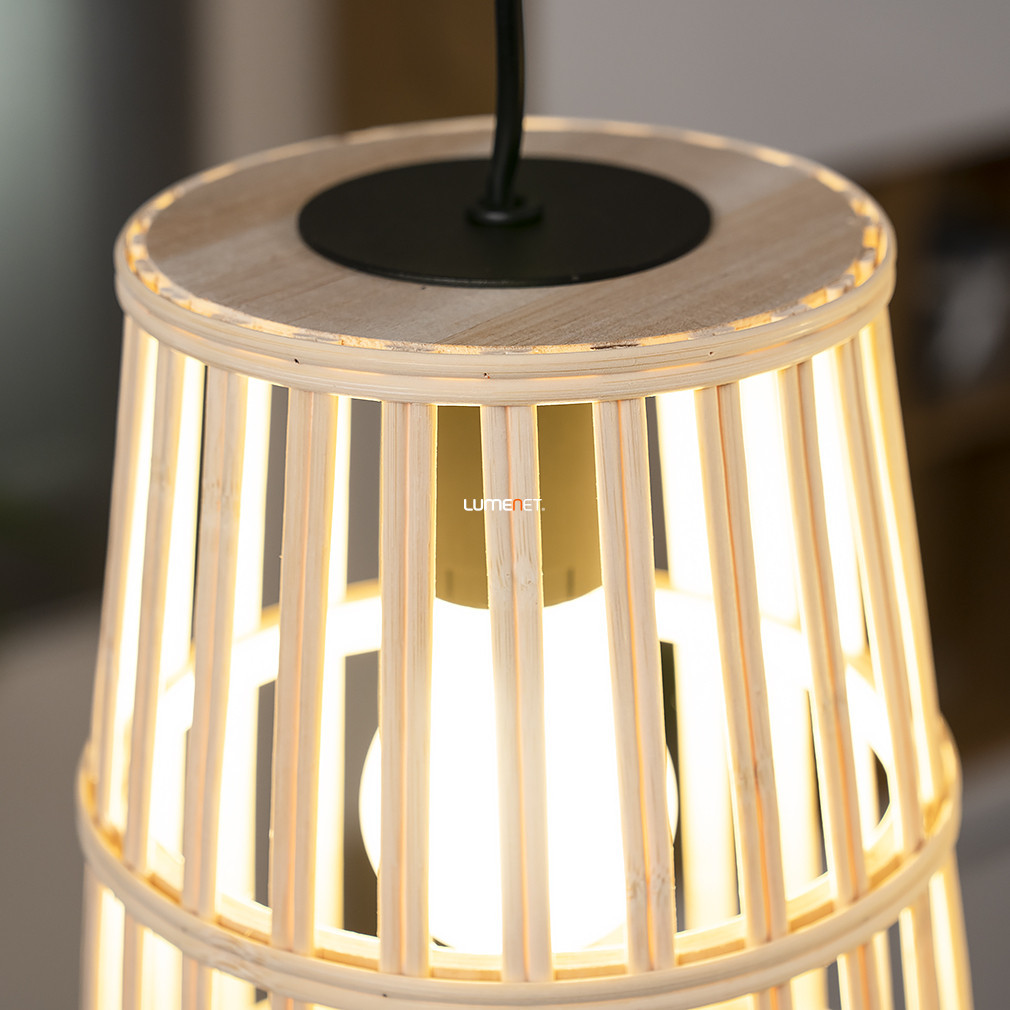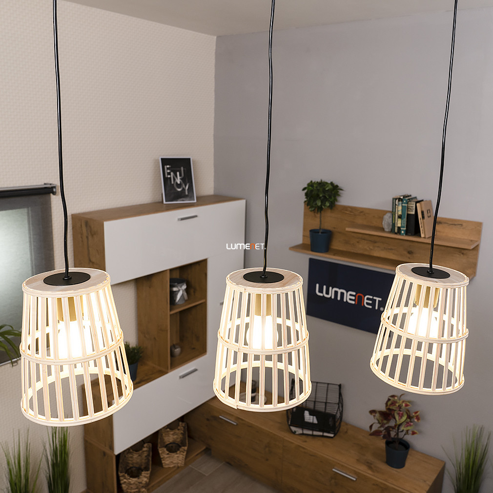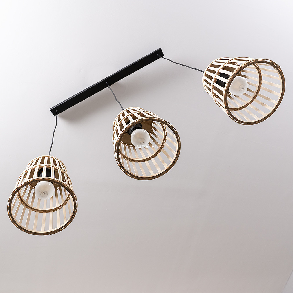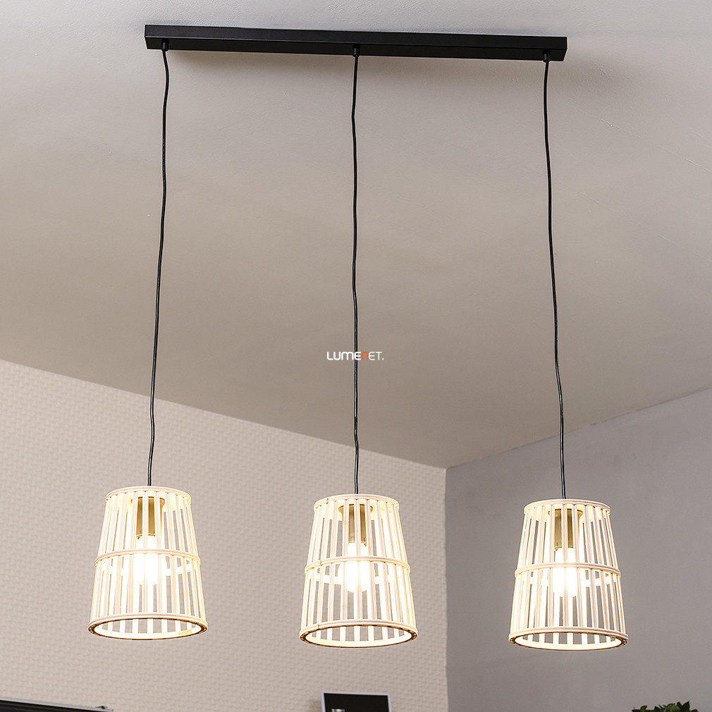 Lampa suspendată Eyam Eglo 33202 din lemn în culoare naturală oferă un aspect modern în stil etnic. Abajurul este realizat dintr-o combinație de oțel și lemn în culori negru și maro. Produsul are trei socluri E27, care pot fi echipate cu surse de lumină înlocuibile. Fluxul luminos, temperatura culorii și puterea depind de becurile utilizate. Lampa nu este reglabilă și are protecție IP20, fiind potrivită pentru utilizare în interior. Dimensiunile lămpii sunt: 890 mm lungime, 190 mm lățime și 1110 mm înălțime, cu o greutate de 3,04 kg. Dimensiunile ambalajului sunt: 80 mm lățime, 25 mm lungime și 20 mm înălțime. Produsul nu include o sursă de lumină și este fabricat de EGLO.