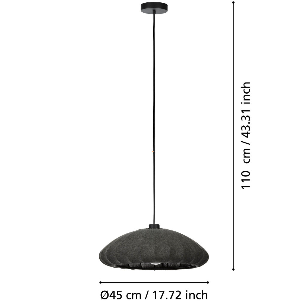 Lampa suspendată din material textil Barlaston Eglo 43961 este un model cu un diametru de 45 cm și o înălțime de 110 cm, fabricat de EGLO. Abajurul este realizat din oțel și material textil, într-o combinație de culori negru și gri. Are o soclu E27, care poate fi echipat cu o sursă de lumină înlocuibilă, dar sursa de lumină nu este inclusă în pachet. Produsul are un grad de protecție IP20, ceea ce îl face potrivit pentru utilizare în interior. Lampa cântărește 0,902 kg, iar dimensiunile ambalajului sunt 46x46x15 cm. Codul său logistic este 43961.
