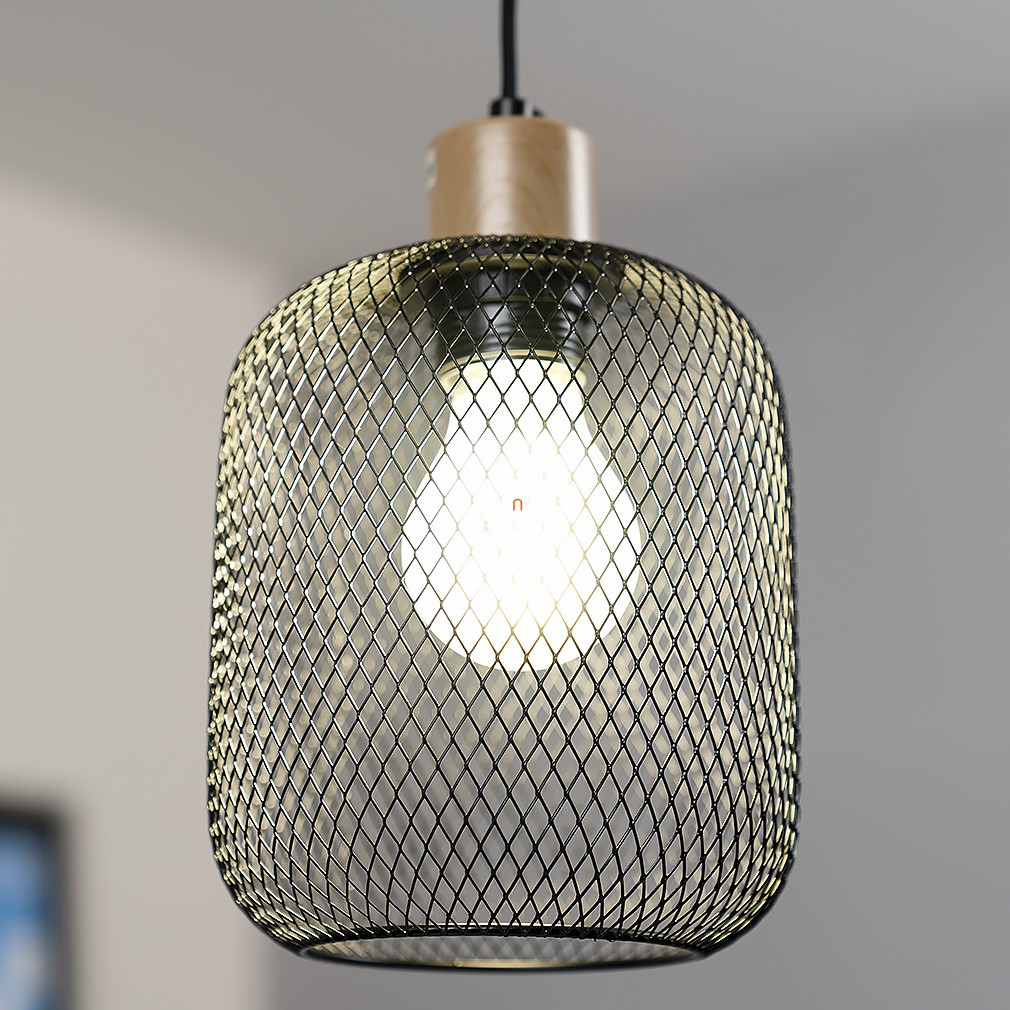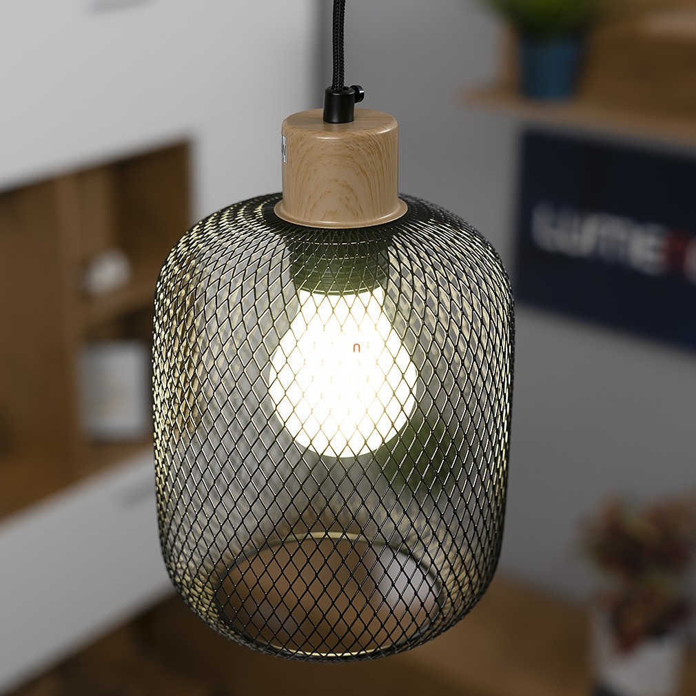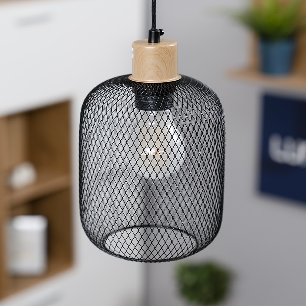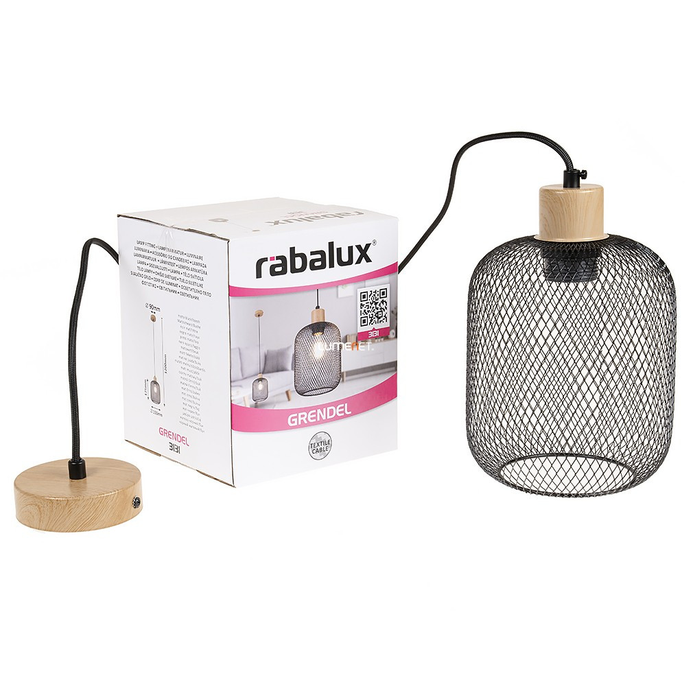 Lampa suspendată din plasă metalică Grendel Rábalux 3131 are un design în stil vintage, care combină lemnul și metalul negru. Lampa este prevăzută cu un singur soclu E27, care poate fi utilizat cu o sursă de lumină înlocuibilă. Lampa nu include o sursă de lumină, astfel încât puterea, fluxul luminos, temperatura culorii și culoarea luminii vor varia în funcție de becul ales. Produsul nu este reglabil și are protecție IP20, fiind potrivit pentru utilizare în interior. Are un diametru de 150 mm, o înălțime de 1200 mm și cântărește doar 0,33 kg. Dimensiunile ambalajului sunt 18x15x15 cm, iar producătorul este Rábalux.