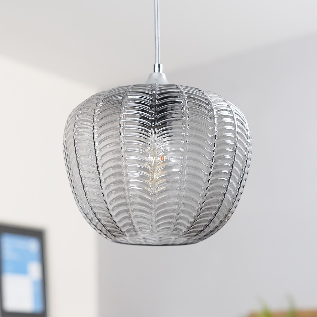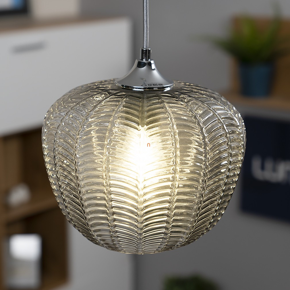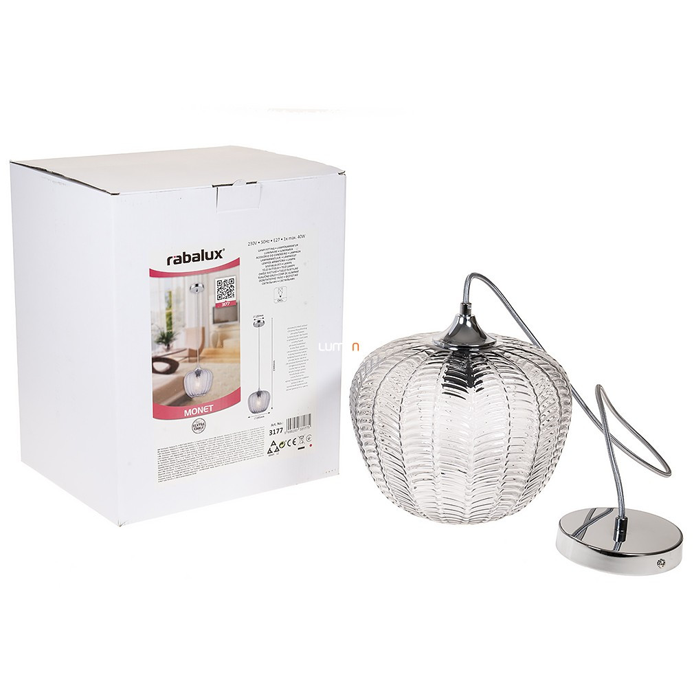 Lampa suspendată Monet Rábalux 3177 este un corp de iluminat în stil modern, cu un abajur din sticlă cu model și o suprafață cromată, de culoare fumurie. Materialele principale ale lămpii sunt metalul și sticla, are un soclu E27 și poate fi utilizată cu o singură sursă de lumină, care nu este inclusă. Lampa este proiectată pentru surse de lumină înlocuibile, astfel încât fluxul luminos, culoarea luminii, puterea și temperatura culorii depind de becul ales. Produsul nu este reglabil, are un grad de protecție IP20 și este recomandat pentru utilizare în interior. Diametrul său este de 235 mm, înălțimea maximă este de 1900 mm, iar greutatea este de 1,32 kg. Dimensiunile ambalajului sunt: 23 cm lățime, 27 cm lungime și 34 cm înălțime. Producătorul este Rábalux.