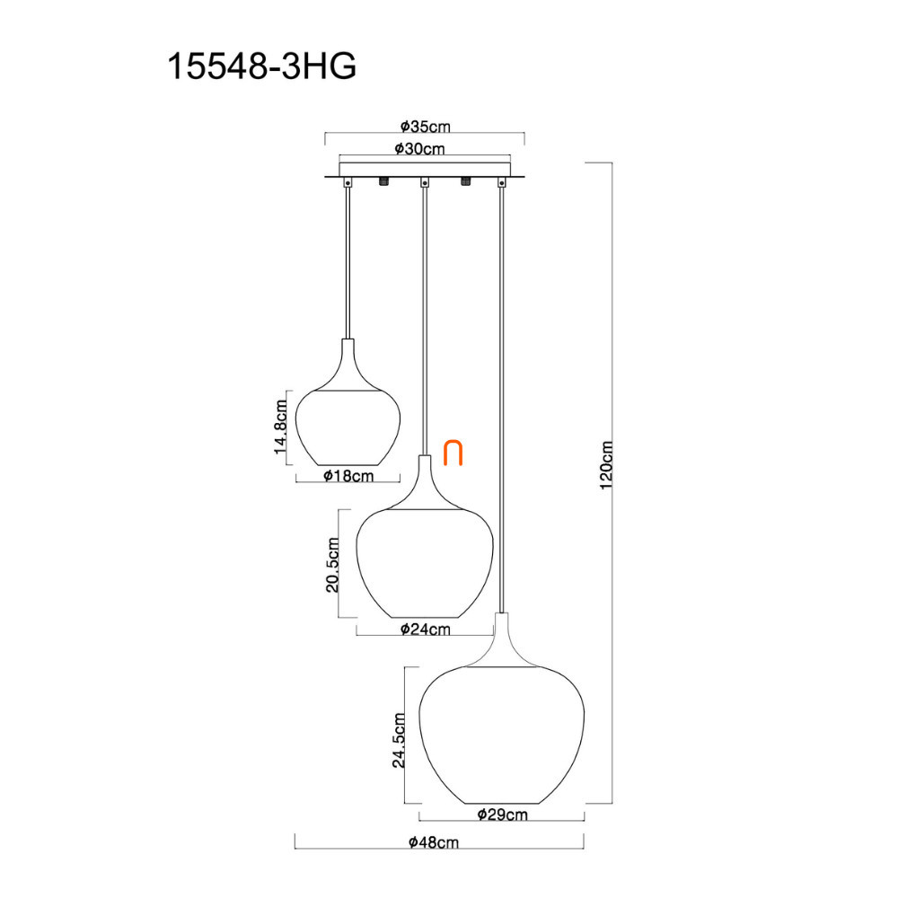 Lampa suspendată din sticlă Maxy Globo 15548-3HG este realizată în nuanțe elegante de cupru roșu, combinate cu detalii negre mate. Are trei socluri E27, care pot fi echipate cu surse de lumină interschimbabile la alegere, permițându-vă să determinați liber fluxul luminos, temperatura culorii și puterea. Lampa are un diametru de 480 mm, o înălțime de 1200 mm, este fabricată din metal și sticlă și are un grad de protecție IP20. Tensiunea nominală este de 230 V, iar produsul cântărește 1,1 kg. Dimensiunile ambalajului sunt 48x61x35 cm. Lampa nu include o sursă de lumină, astfel încât utilizatorul poate alege becurile care se potrivesc cel mai bine nevoilor sale. Produsul este fabricat de Globo.