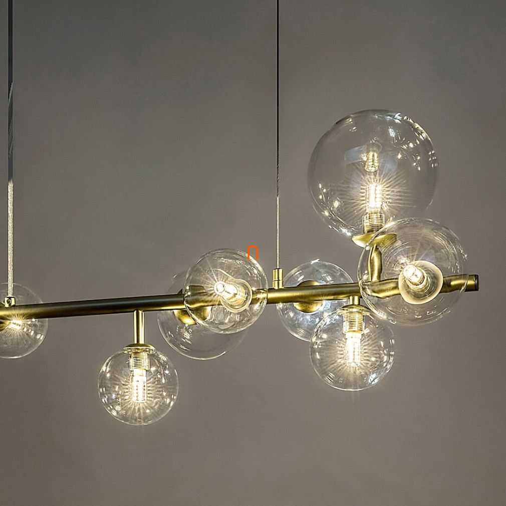 Lampa suspendată Aslov Rábalux 72298 este o soluție modernă de iluminat, realizată din metal auriu și sticlă transparentă. Lampa are zece socluri G9, care pot fi echipate cu surse de lumină înlocuibile, permițând reglarea intensității luminoase, a temperaturii culorii și a puterii în funcție de nevoile utilizatorului. Produsul are o tensiune nominală de 230 V și un grad de protecție IP20, fiind potrivit pentru utilizare în interior. Lampa are o lungime de 800 mm, o lățime de 100 mm și o înălțime de 1200 mm, iar greutatea sa este de 2,2 kg. Pachetul nu include o sursă de lumină, iar corpul de iluminat este potrivit pentru iluminatul decorativ și funcțional în diverse spații interioare.