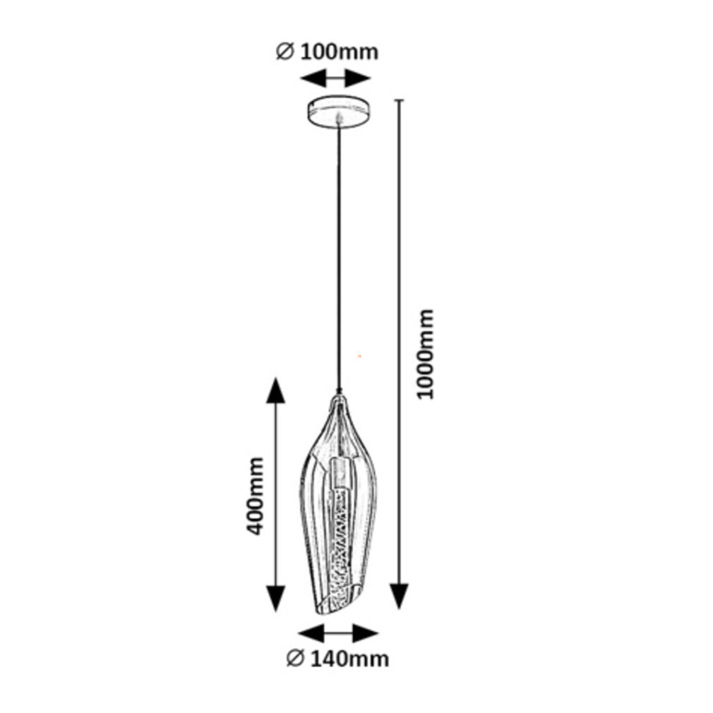 Lampa suspendată Bellini Rábalux 72201 este realizată din sticlă de culoare chihlimbar, cu capătul conic și structură metalică neagră. Corp de iluminat cu design unic, cu diametrul de 400 mm și înălțimea de 1000 mm. Corpul de iluminat are o singură soclu E27, care poate fi echipat cu o sursă de lumină înlocuibilă, permițându-vă să alegeți liber fluxul luminos, temperatura culorii și puterea. Lampa nu include o sursă de lumină, iar gradul de protecție IP20 o face potrivită pentru utilizare în interior. Cablul acoperit cu material textil conferă un aspect elegant, în timp ce sticla de culoare chihlimbar creează un efect de iluminare difuz. Produsul cântărește 0,88 kg, iar dimensiunile ambalajului sunt 19x19x26 cm. Producătorul este Rábalux.