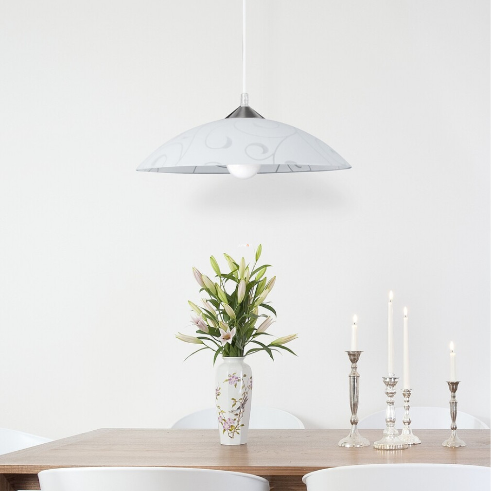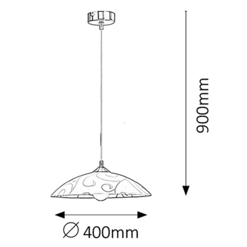 Lampa suspendată Harmonylux Rábalux 3856 are un design elegant cu model de viță de vie, realizat dintr-o combinație de sticlă albă și materiale metalice. Lampa este echipată cu un singur soclu E27, care permite utilizarea unei surse de lumină înlocuibile. Produsul nu include o sursă de lumină, astfel încât fluxul luminos, culoarea luminii, puterea și temperatura culorii depind de becul ales de utilizator. Lampa are o tensiune nominală de 230 V și un grad de protecție IP20, fiind potrivită pentru utilizare în interior. Diametrul său este de 400 mm, înălțimea de 900 mm și greutatea de 1,02 kg. Dimensiunile ambalajului sunt 41x41x10 cm. Produsul este fabricat de Rábalux, iar codul său logistic este 3856.