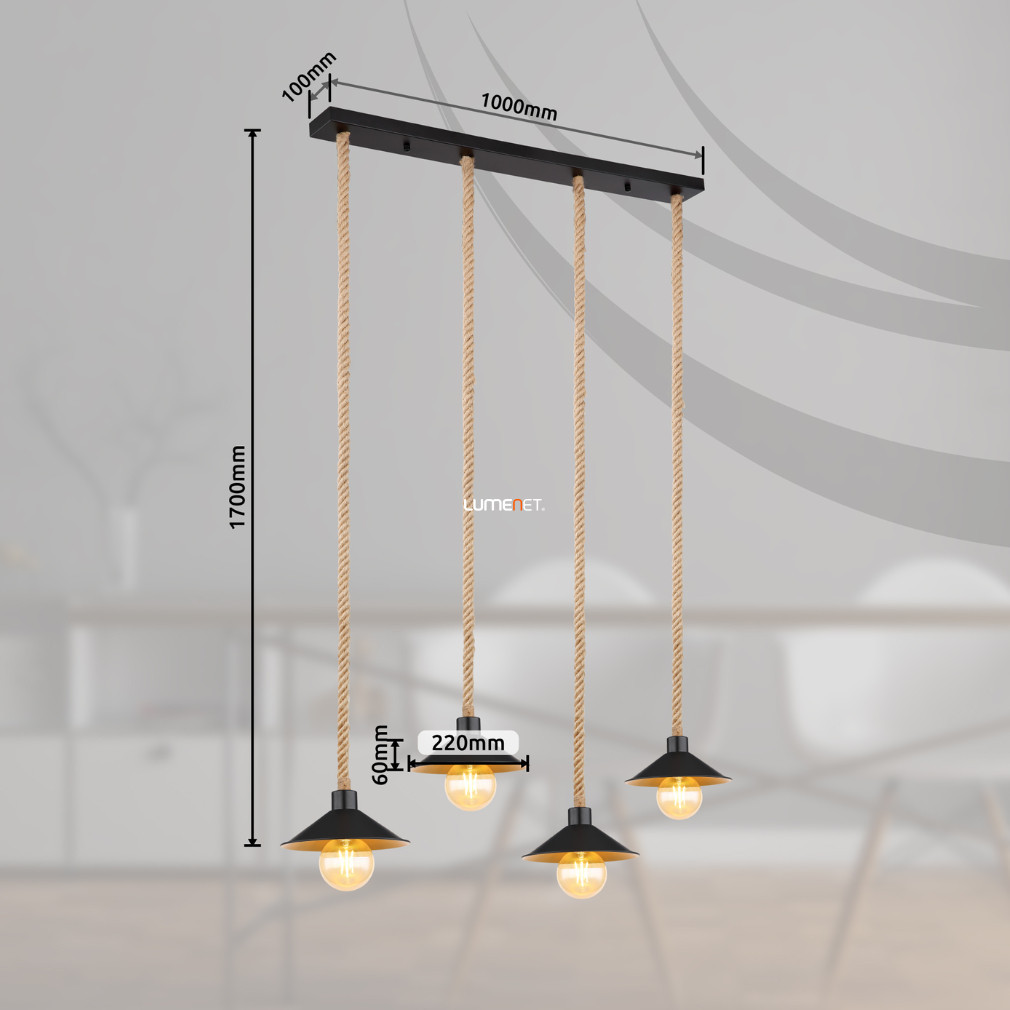 Lampa suspendată Diana Globo 15690-4H are patru socluri E27, permițând utilizarea diferitelor tipuri de surse de lumină înlocuibile. Lampa are protecție IP20 și este potrivită în principal pentru utilizare în interior. Lampa în stil vintage este fabricată din metal și frânghie și este disponibilă în culorile negru, auriu și maro, conferind interiorului dvs. un aspect distinctiv. Lampa are o lungime de 1125 mm, o lățime de 220 mm și o înălțime de 1700 mm. Produsul cântărește 3,47 kg. Sursele de lumină nu sunt incluse în pachet; fluxul luminos, culoarea luminii și temperatura culorii depind de becul selectat. Lampa nu este reglabilă și poate fi utilizată numai la o luminozitate fixă. Fabricată de Globo.