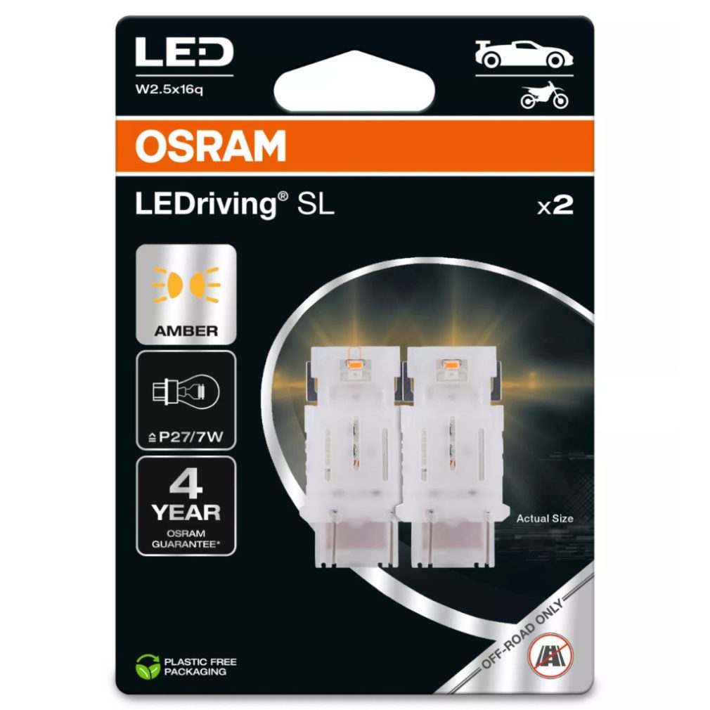 Bec LED Osram LEDriving SL P27/7W chihlimbar, putere luminoasă dublă, soclu W2.5x16q, ≙ P27/7W, pentru semnalizare modernă și indicatoare de direcție, 3157DYP-2BL