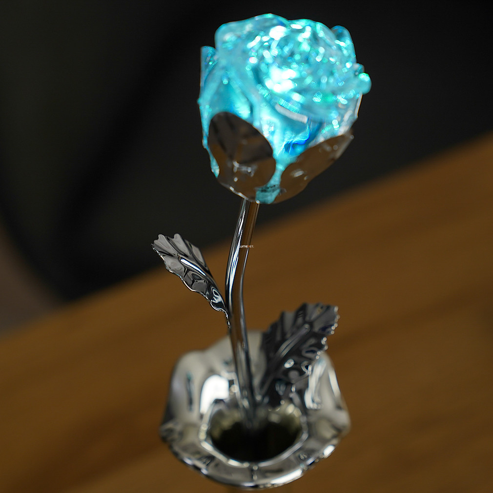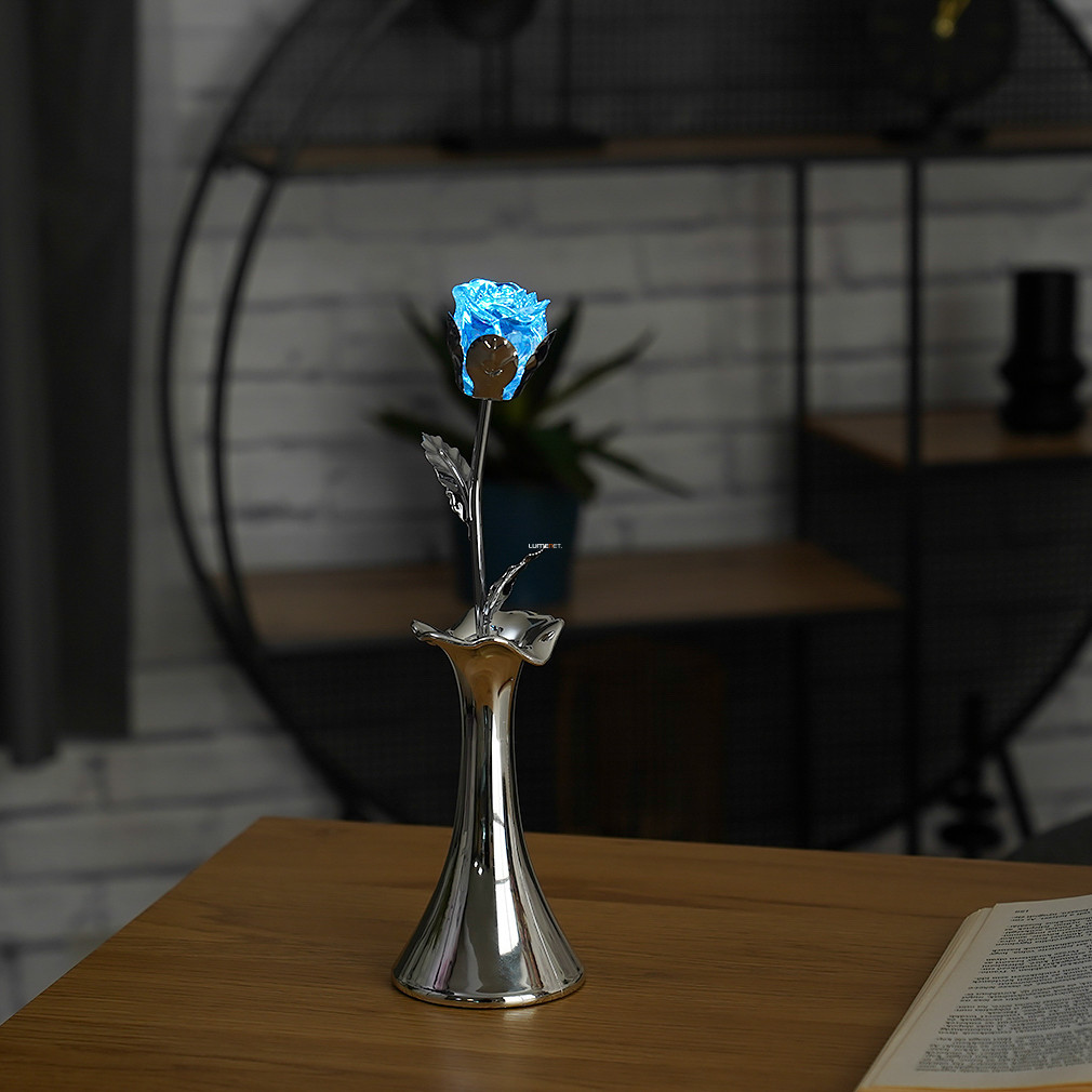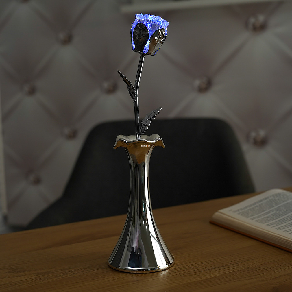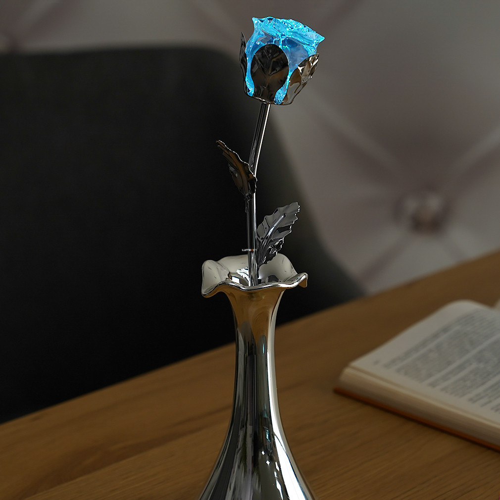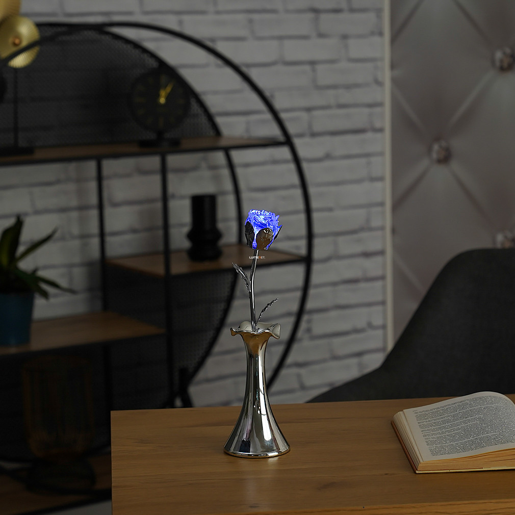 Jimmy Globo 28112 Desktop RGB LED Rose este o lampă de masă decorativă, înaltă de 29 cm, cu un modul LED care schimbă culoarea (RGB). Corpul lămpii este de culoare cromată și este fabricat din metal și plastic. Modulul LED încorporat are o putere nominală de 0,06 W și este alimentat de trei baterii AAA, care nu sunt incluse în pachet. Produsul are un grad de protecție IP20, fiind potrivit numai pentru utilizare în interior. Are un diametru de 82 mm și o înălțime de 290 mm. Dimensiunile ambalajului sunt 8x8x30 cm. Lampa nu este reglabilă, sursa de lumină nu este înlocuibilă și este fabricată de Globo.
