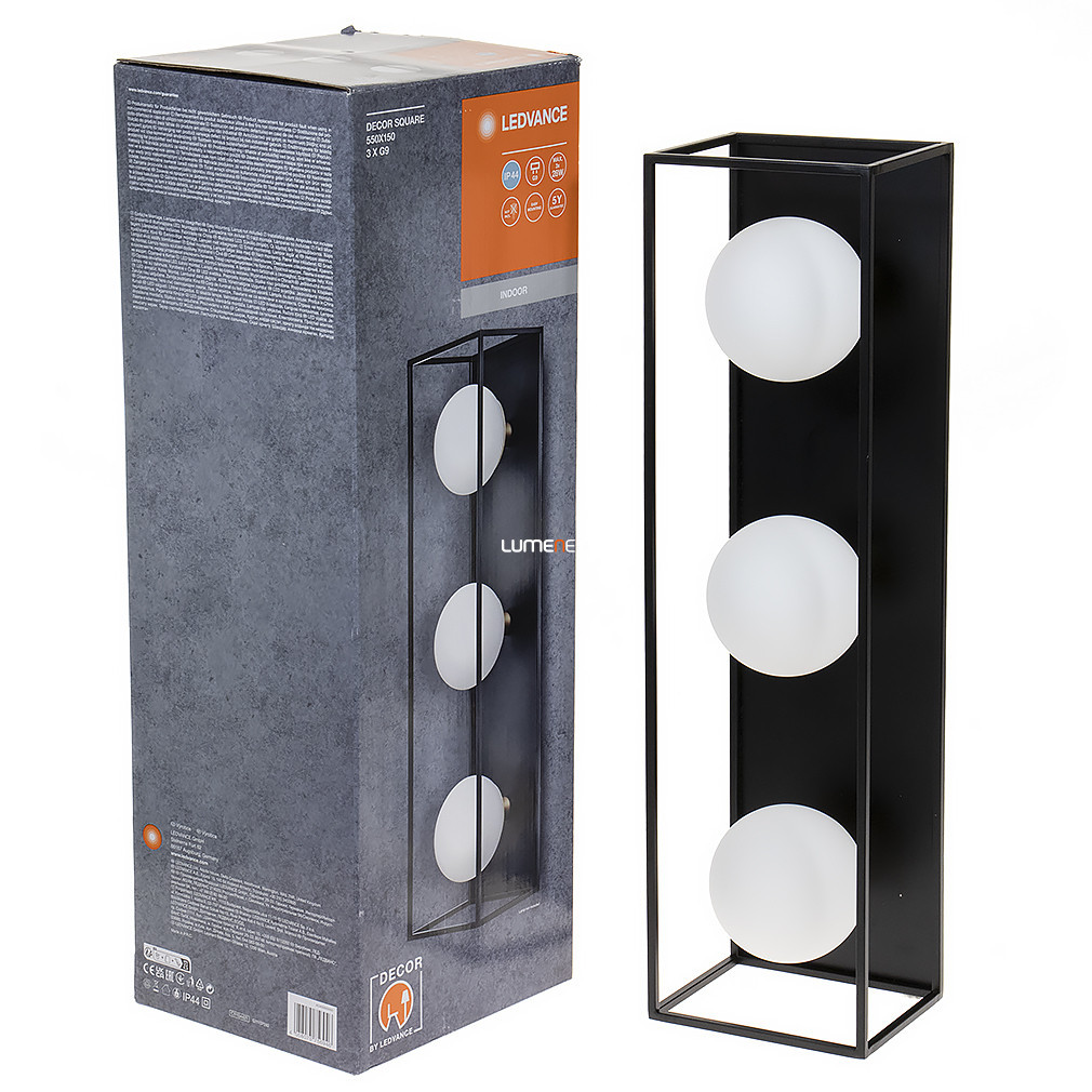 Lampa de perete cu ramă Ledvance are trei socluri G9, astfel încât poate fi utilizată cu surse de lumină înlocuibile. Corpul lămpii este fabricat din oțel negru, cu un design modern, angular, având dimensiunile de 550 mm lungime, 150 mm lățime și 155 mm înălțime. Produsul are protecție IP44, fiind rezistent la stropire și potrivit pentru utilizare în interior și în exterior acoperit. Sursele de lumină nu sunt incluse în pachet, iar lampa nu este reglabilă. Corpul de iluminat cântărește 2,3 kg și are dimensiuni de ambalare de 60 mm lățime, 200 mm lungime și 200 mm înălțime. Produsul este fabricat de Ledvance, iar codul său logistic este 4058075756946.