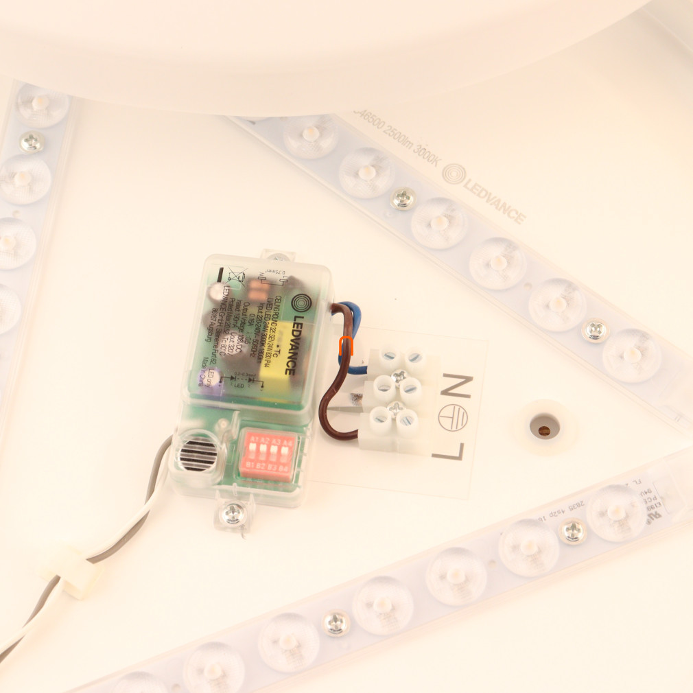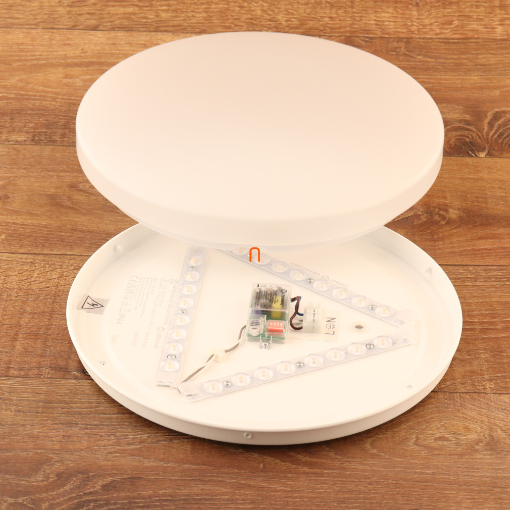 Lampa de tavan pentru baie Ledvance cu senzor de zgomot are un modul LED încorporat de 24 W care oferă o putere luminoasă de 1800 lumeni, cu o temperatură de culoare albă caldă de 3000 Kelvin. Corp de iluminat este fabricat din oțel, de culoare albă, cu un diametru de 325 mm și o înălțime de 72 mm. Unghiul de distribuție a luminii de 120° asigură o distribuție uniformă a luminii. Clasa de protecție IP44 îl face potrivit pentru utilizarea în băi, deoarece este rezistent la stropirea cu apă. Produsul este echipat cu un senzor de zgomot și luminozitate, iar luminozitatea poate fi reglată în interiorul corpului de iluminat. Modulul LED funcționează la o tensiune nominală de 220-240 V, cu un indice de redare a culorilor de 80 și o durată medie de viață de 20.000 de ore. Dimensiunile ambalajului sunt 36x36x8 cm, iar produsul cântărește 0,78 kg. Lampa este fabricată de Ledvance.