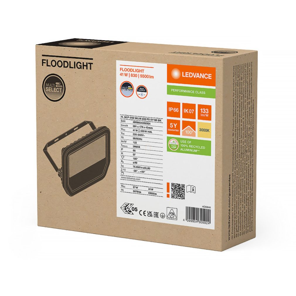 Ledvance Professional Floodlight 50 spot LED reglabil, 5500 lm/3670 lm, 3000 K, 41W, RA80, 100 °x 100 °, IP66, 201mm