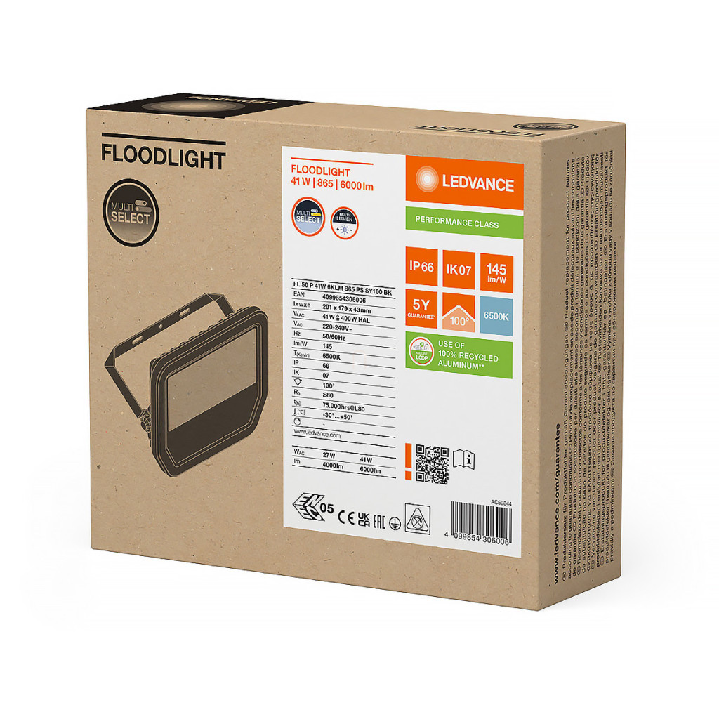Ledvance Professional Floodlight 50 spot LED reglabil, 6000 lm/4000 lm, 6500 K, 41W, RA80, 100 °x 100 °, IP66, 201 mm